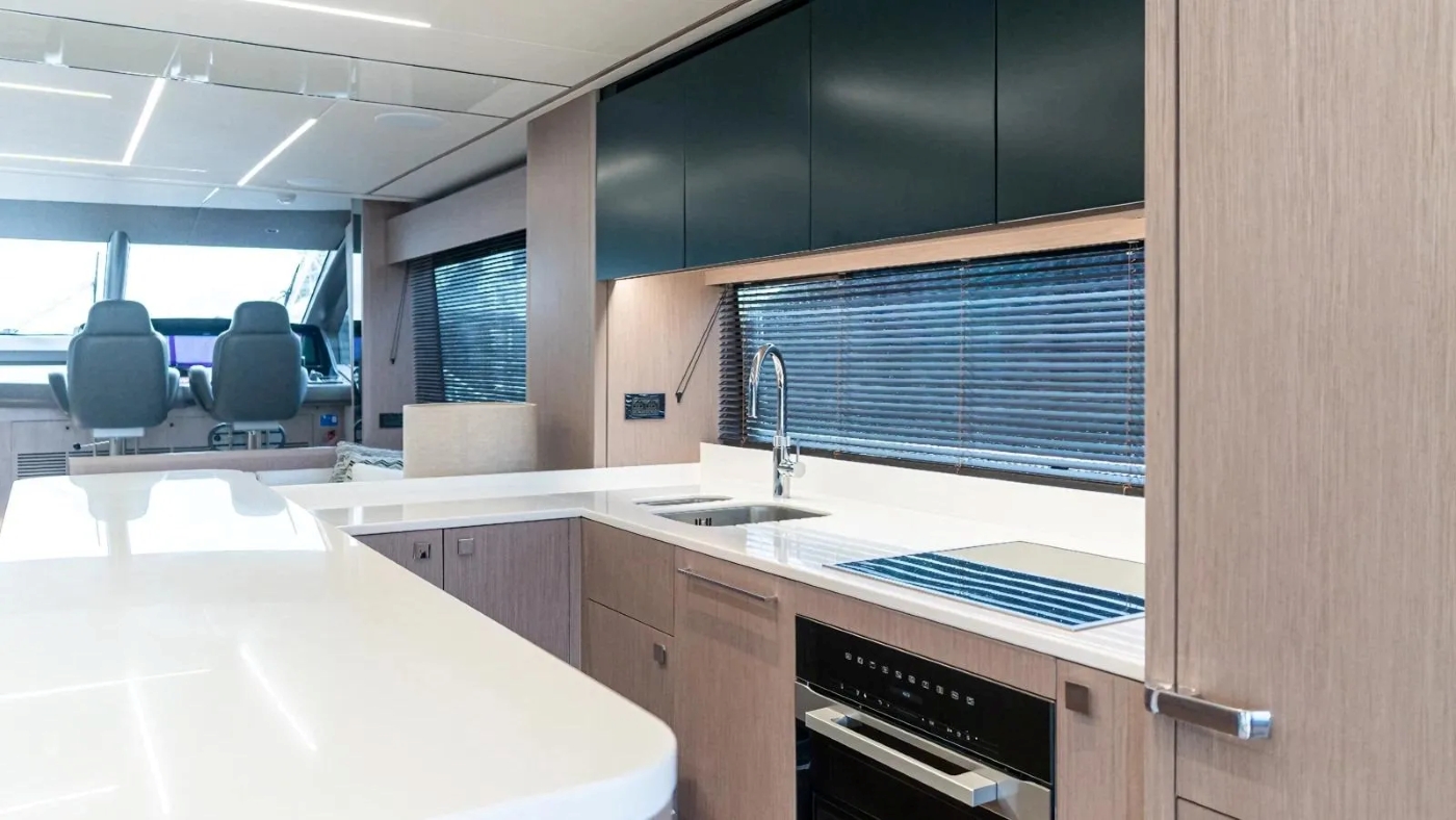 Her custom-finished flybridge is fitted with a Jet Black canopy and matching detailing across the radar arch and antennae, offering both visual impact and comfort.