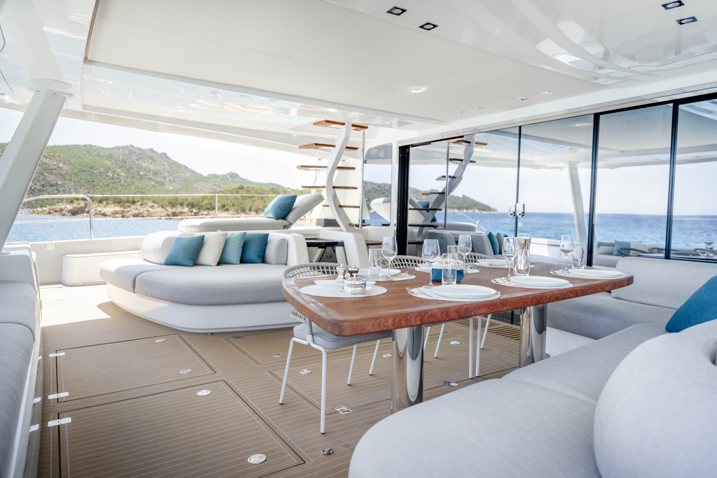 Sunpads invite lounging under the tropical or Mediterranean sun, while shaded al fresco dining areas provide retreats during warm days or glowing evenings. The sail plan and hull lines reflect Lagoon’s naval architecture in collaboration with VPLP, offering a sleek profile that balances performance with comfort.