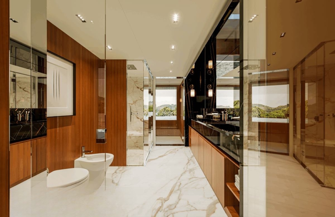 Guest accommodations on the lower deck echo the same harmony of materials – fine wood panelling, polished black finishes, marble ensuite bathrooms – ensuring a consistent atmosphere of discreet luxury across all decks.