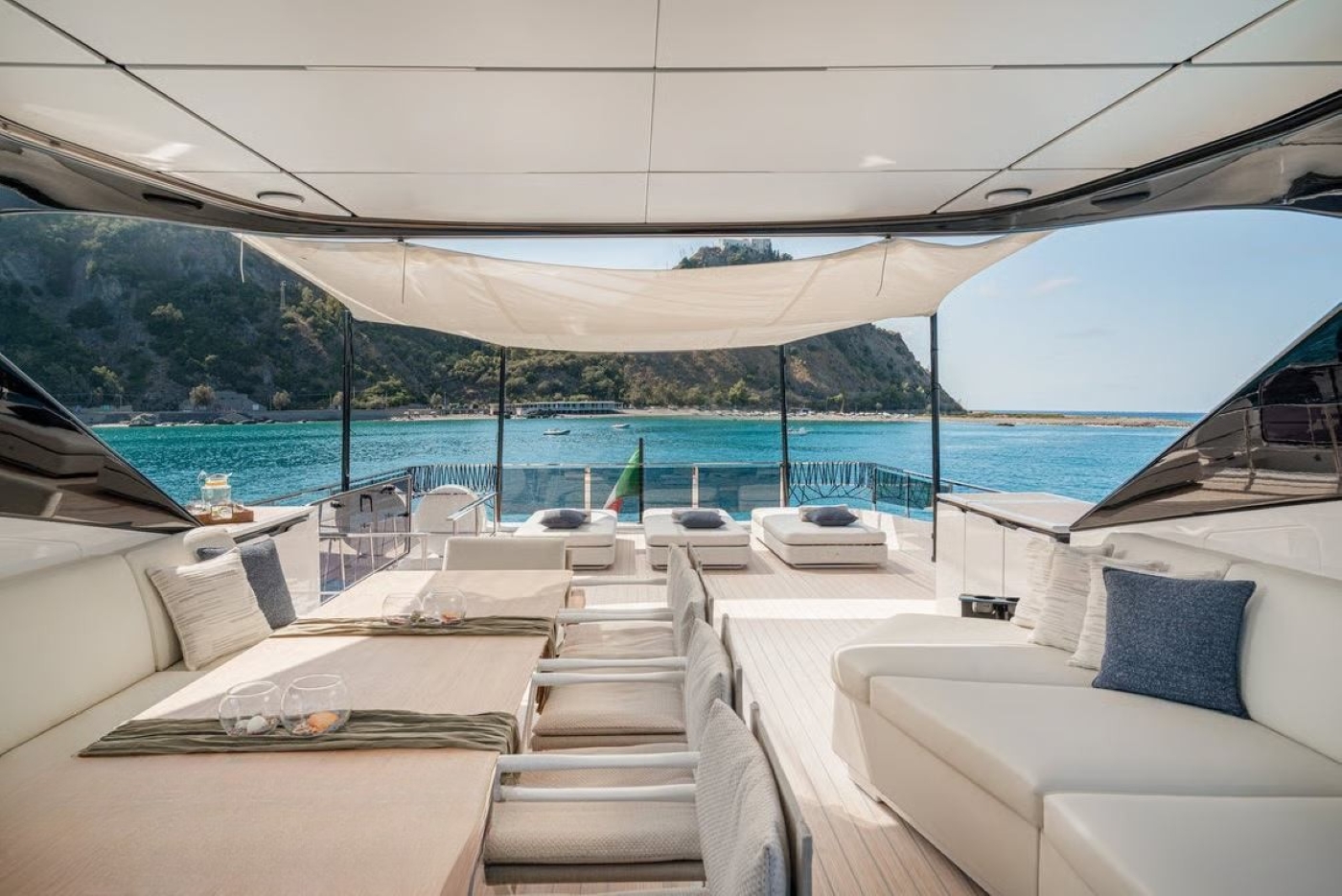 (Ferretti Sustainable Enhanced Architecture) ~Outdoor living priority – terrace, sun pads, alfresco spaces ~Tender garage with Williams SportJet ~Extensive water toy inventory ~Air conditioning and Wi Fi throughout ~Discreet, attentive 4 member crew