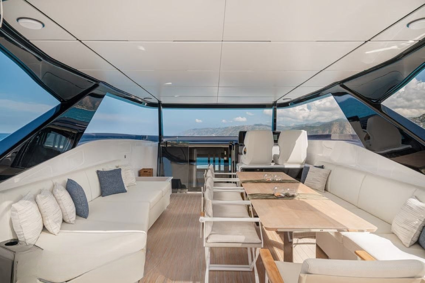 (Ferretti Sustainable Enhanced Architecture) ~Outdoor living priority – terrace, sun pads, alfresco spaces ~Tender garage with Williams SportJet ~Extensive water toy inventory ~Air conditioning and Wi Fi throughout ~Discreet, attentive 4 member crew