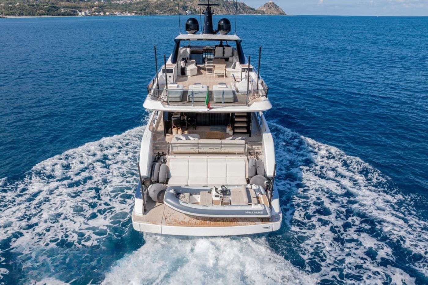 The aft deck offers a graceful transition to the water, with steps leading to the swim platform and space for sunbathing or informal lounging.