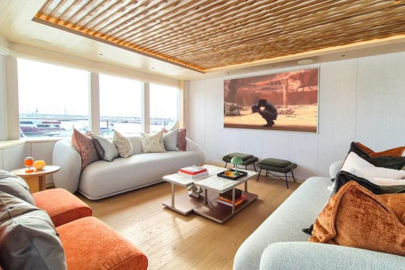 The main salon is a bright and welcoming space, with floor-to-ceiling windows, deep armchairs and neutral-toned furnishings offset by accents of marine blue and bronze. A formal dining area sits aft, creating a sociable flow ...