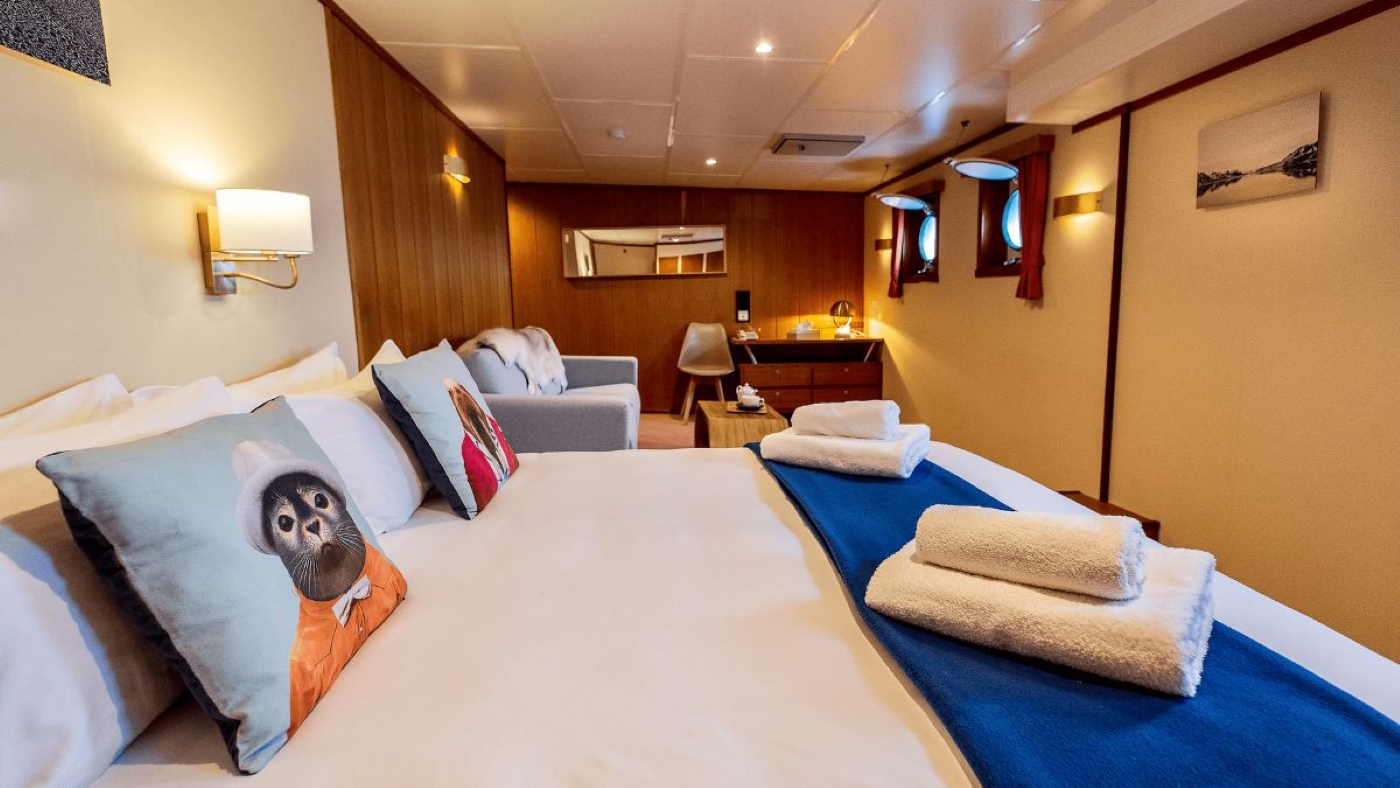 Her expansive foredeck and generous aft deck provide excellent platforms for spotting wildlife — from orcas and walrus to Arctic foxes and reindeer. The aft deck also hosts a wood-fired Finnish sauna with panoramic views, a hot tub, and areas for open-air dining.