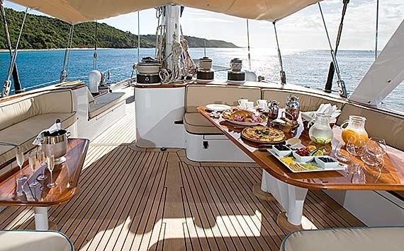 Sailing yacht AXIA has an expansive main saloon and dining area with Munford teak fielded panels and polished brass accents. The yacht has a classical nautical style and graceful elegance that befits her name ‘Axia’ which is the Greek word for Worthy.