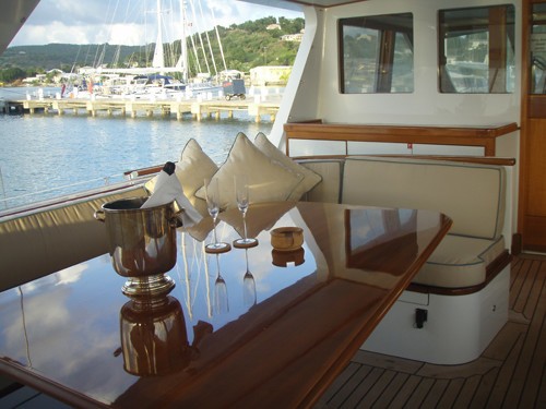 Sailing Yacht AXIA's spacious cockpit area features a large dining table and settees for alfresco entertaining and her large aft deck has teak lounge chairs for relaxing under the sun, stars or shade of the awning.