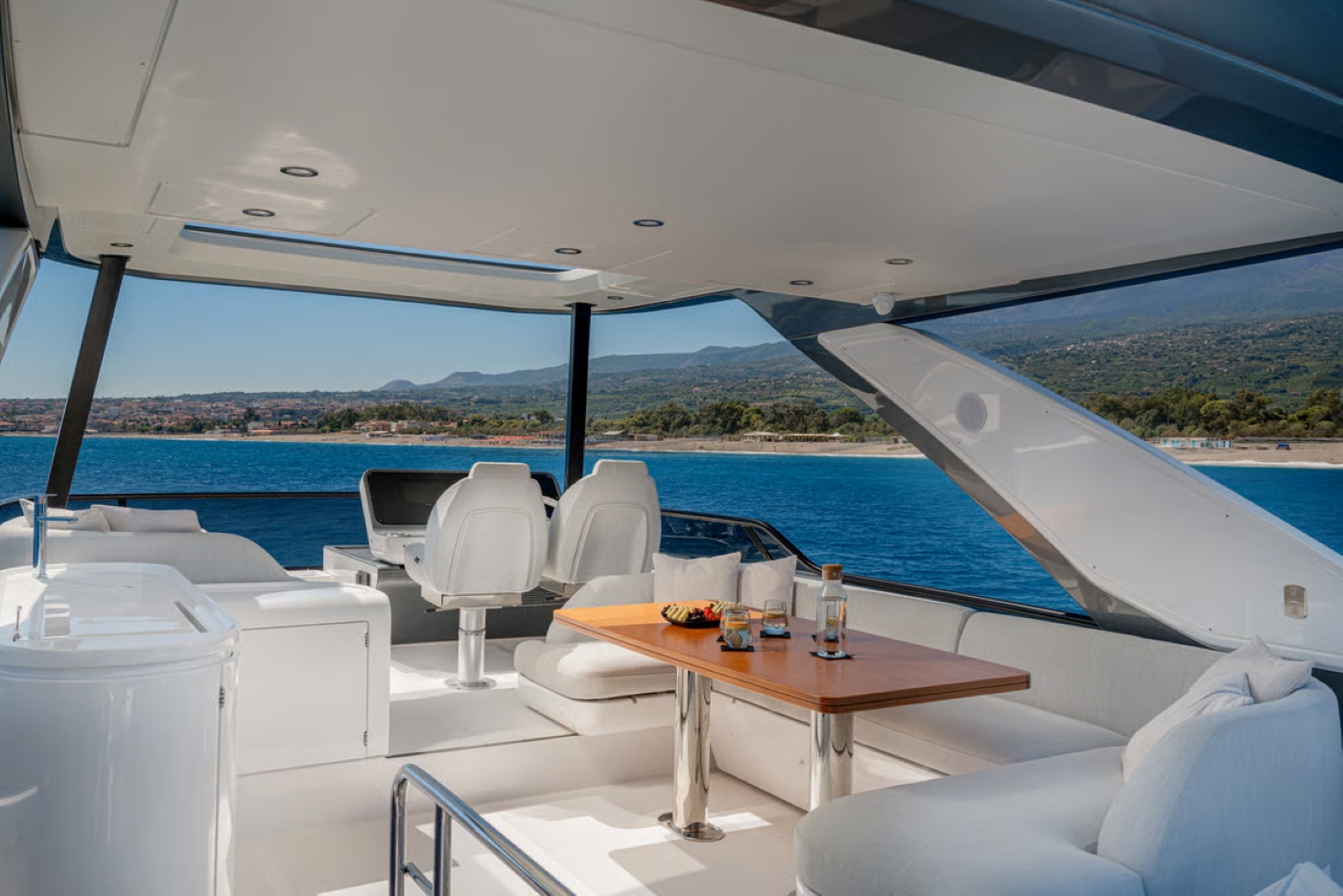 NOTABLE FEATURES OF SBK: ~ Floor to ceiling glazing throughout main deck saloon for panoramic views ~ Spacious flybridge with sunbathing, dining and lounge zones ~ Bow lounge convertible from sofa to full sun pad ~ Elegant ...