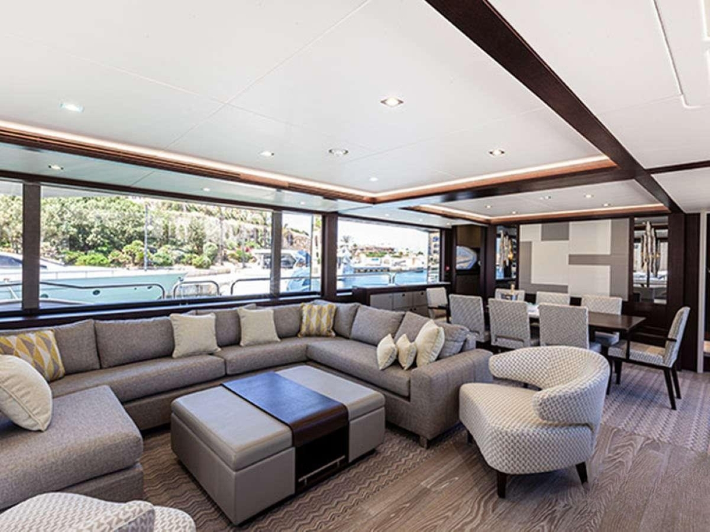 The main salon features a lounge area and dining zone which flow smoothly together, fostering sociable interaction or serene contemplation alike.