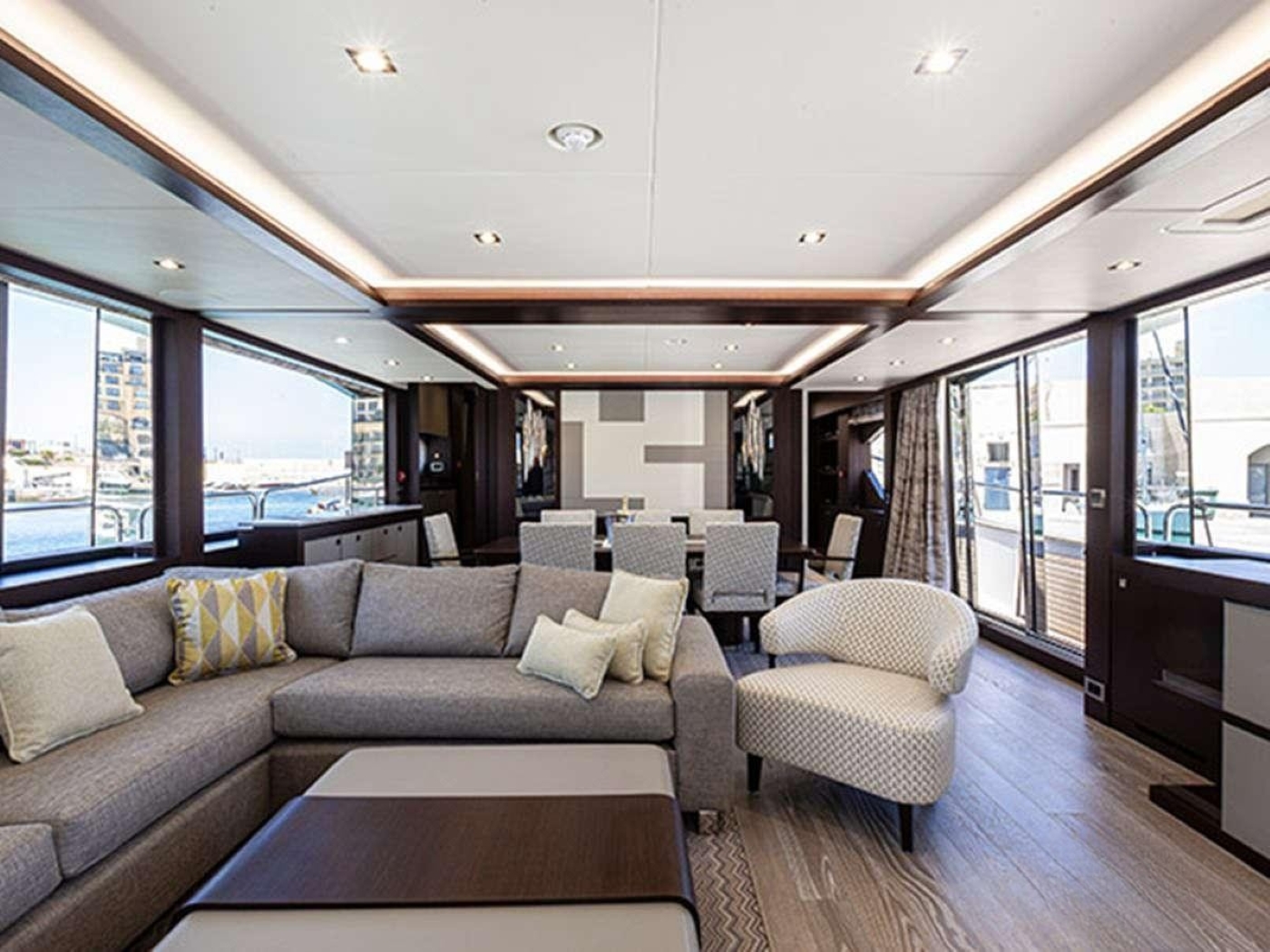 The main salon features a lounge area and dining zone which flow smoothly together, fostering sociable interaction or serene contemplation alike.