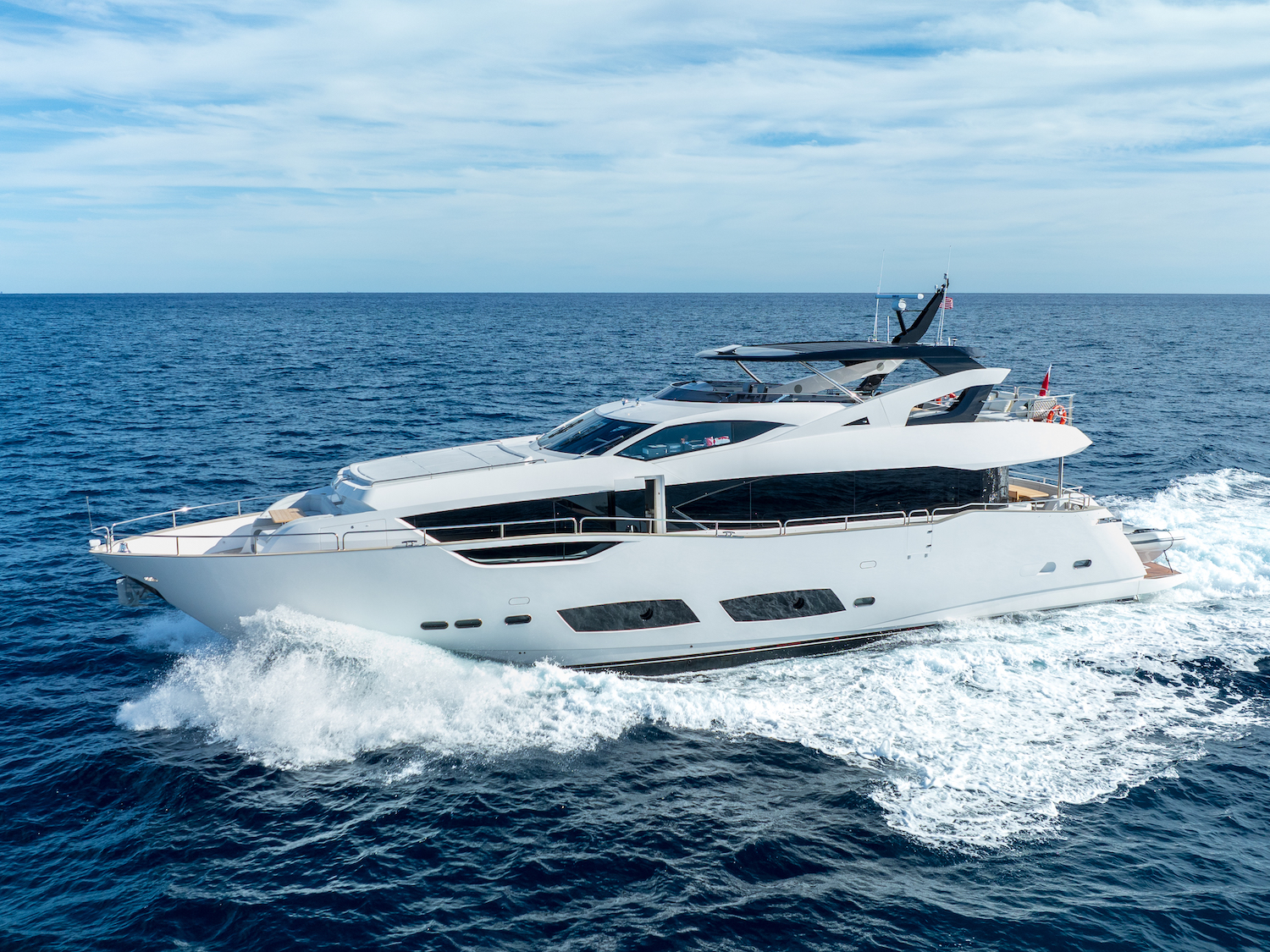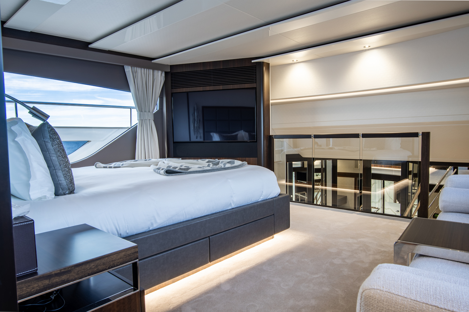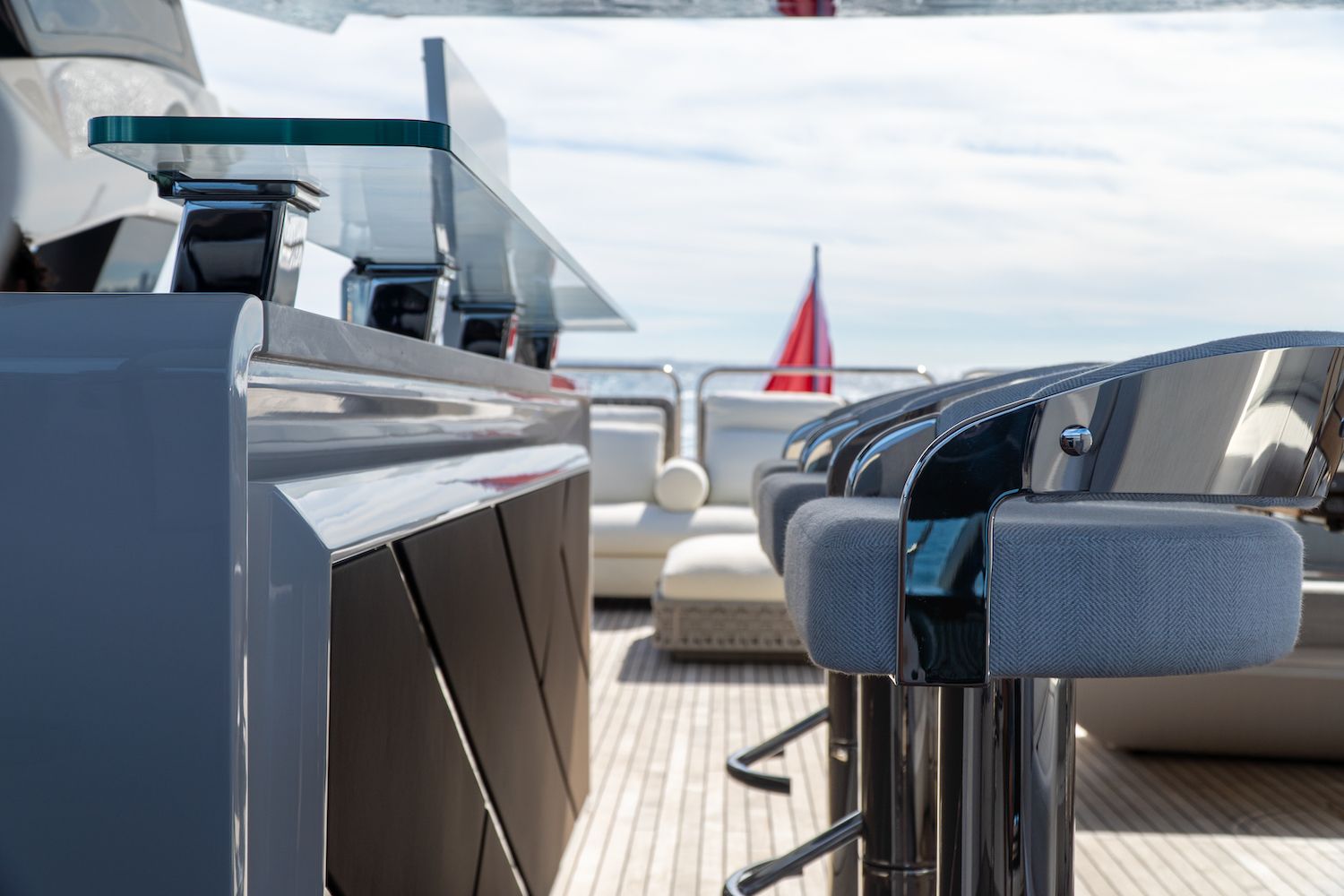 Above, the flybridge extends the social realm – featuring lounge seating, unobstructed views and space for sun soaking or evening cocktails under the stars.