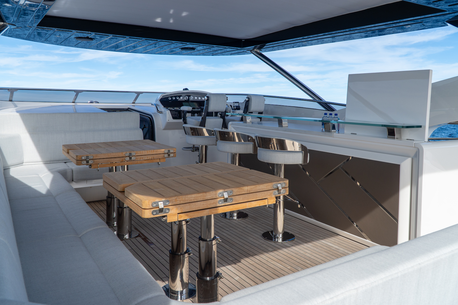 Above, the flybridge extends the social realm – featuring lounge seating, unobstructed views and space for sun soaking or evening cocktails under the stars.