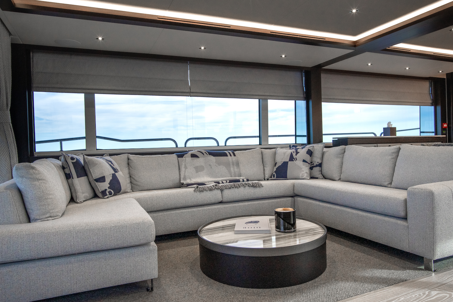 Above, the flybridge extends the social realm – featuring lounge seating, unobstructed views and space for sun soaking or evening cocktails under the stars.