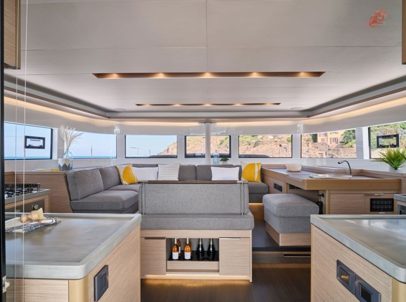 The main salon features a large dining table with a convertible settee, all adjacent to the galley which is designed for practical service and sociable living.