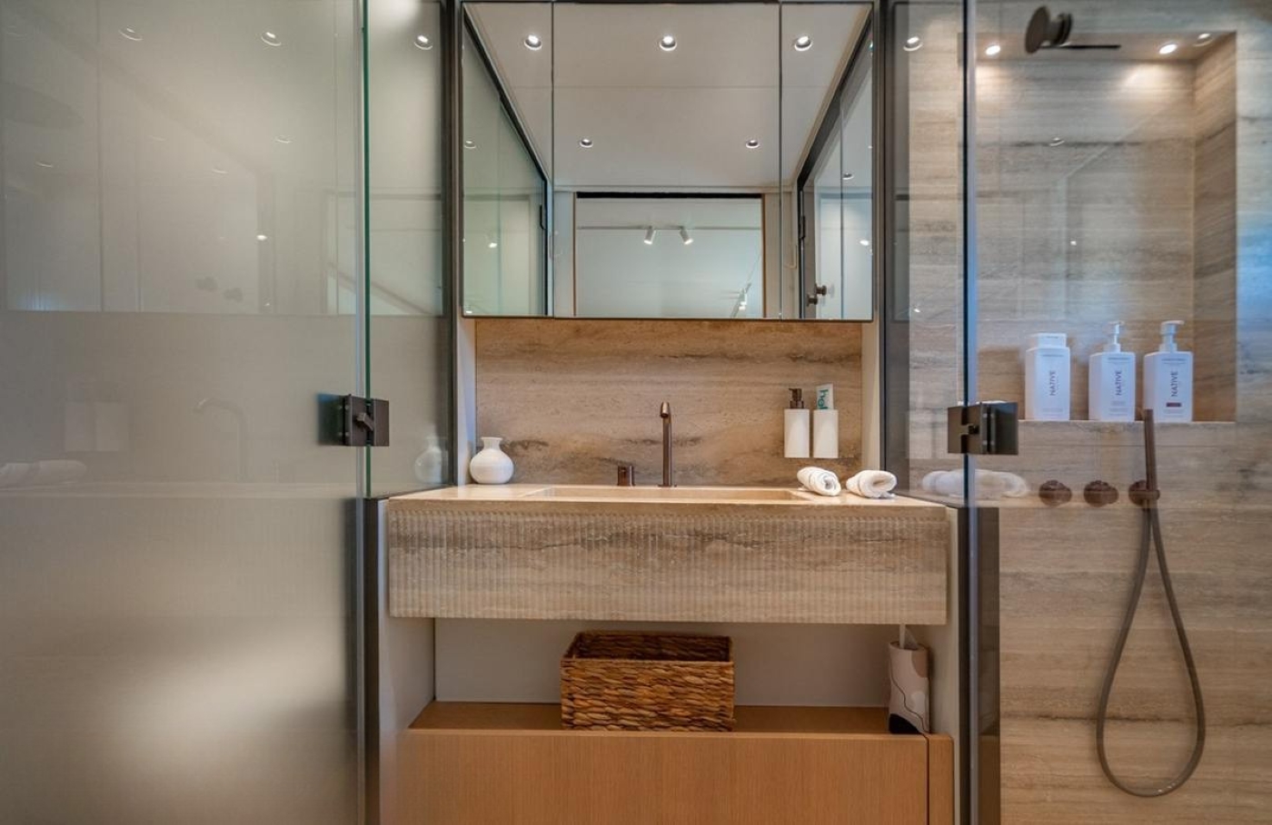Her generous aft deck welcomes guests with a shaded dining area, plush seating, and seamless access to the interior salon. The foredeck offers an intimate sunbathing and lounging area with a canopy for optional shade, perfect for ...