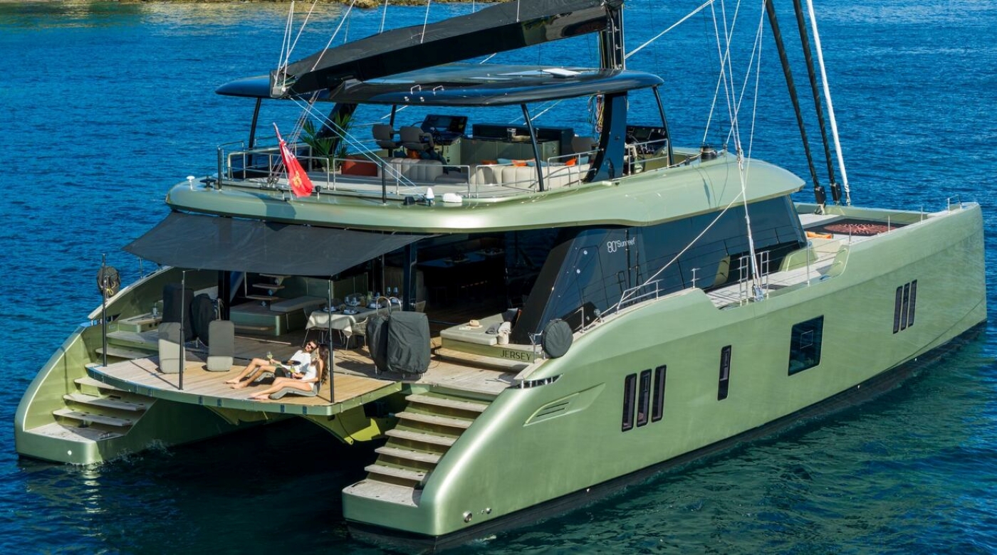 Launched in 2025 by Sunreef Yachts, the 23.99-metre sailing catamaranA-PLAN blends award-winning innovation with bold contemporary styling. With a striking olive-green hull, expansive flybridge and wide 11.5-metre beam, she offers a lifestyle-driven layout across luxurious indoor and outdoor spaces.