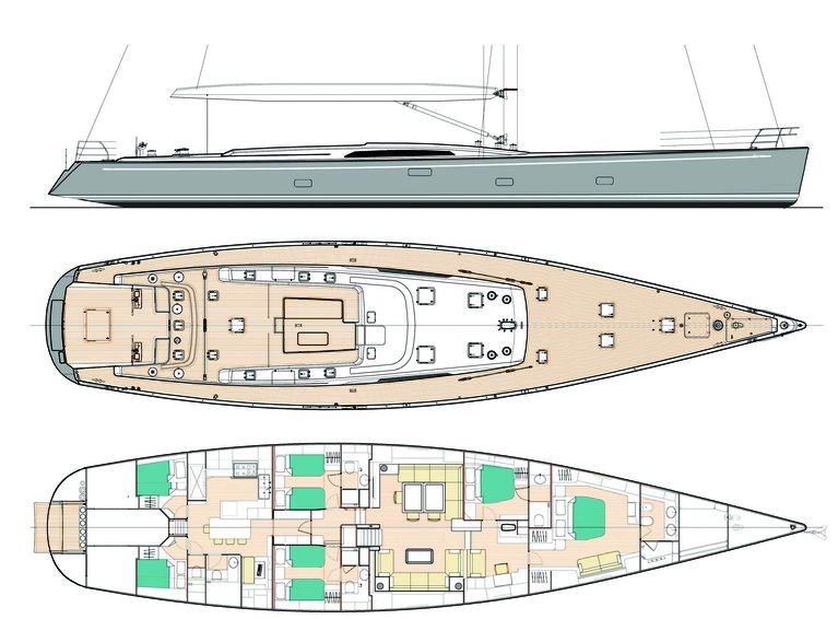 The interior layout follows the classic SWS configuration:- the crew quarters are aft, there are two cabins (with ensuites), and there are a galley and the navigation station.