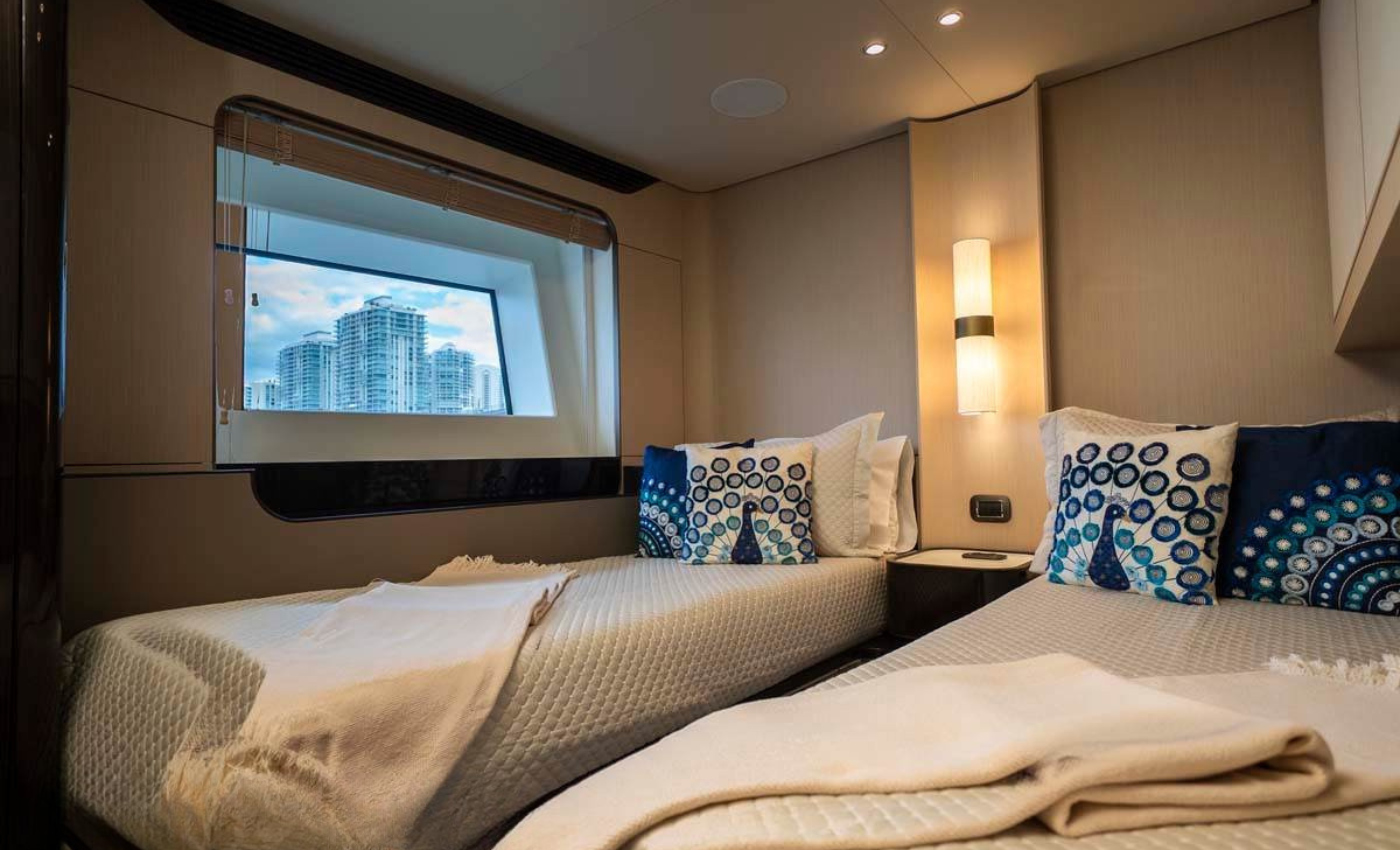 1 Master King, 2 VIP Queen beds, 2 Twin cabins with one pullman. Tender: Williams Diesel Jet 505