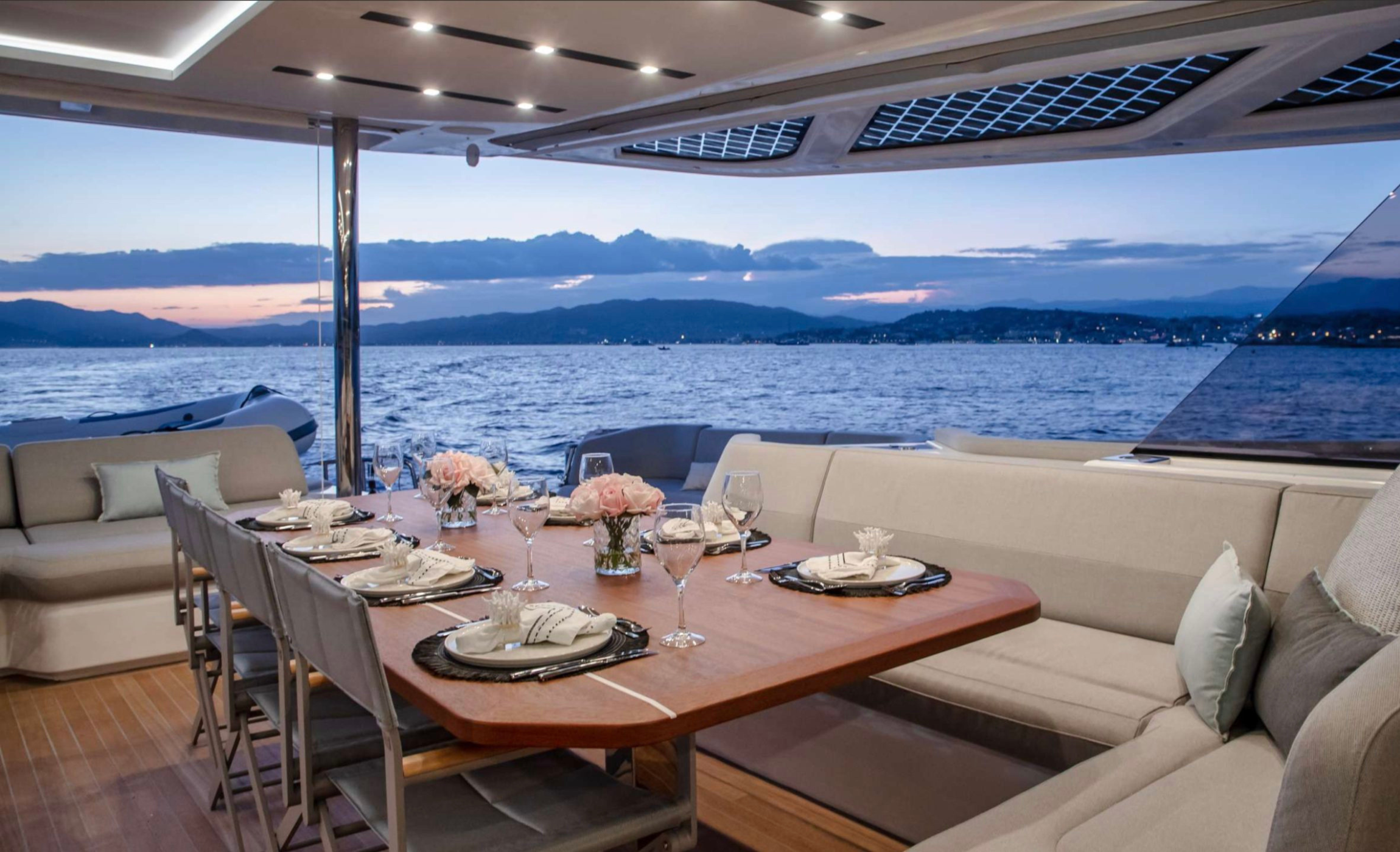 onto the aft dining and lounging areas. Sofas frame the aft deck allowing for plenty of seating and lounging options away from the dining table.