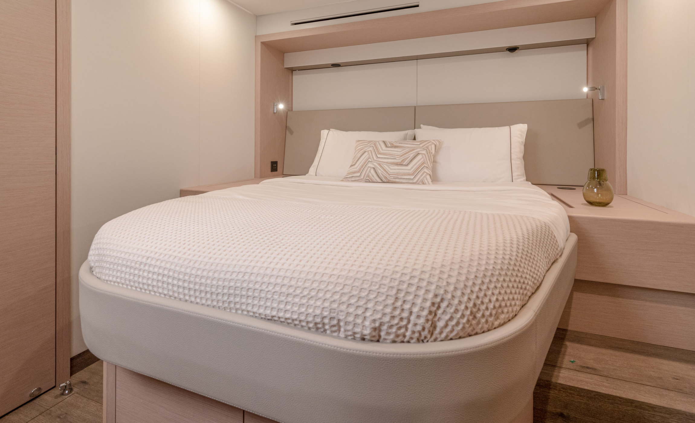 vast catamaran with 5 cabins for 10 guests, comprising one master and one VIP each with a King/Queen sized bed and three additional double cabins.