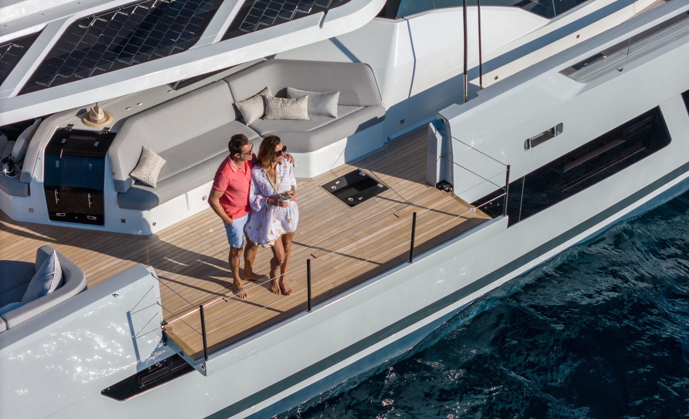onto the aft dining and lounging areas. Sofas frame the aft deck allowing for plenty of seating and lounging options away from the dining table.