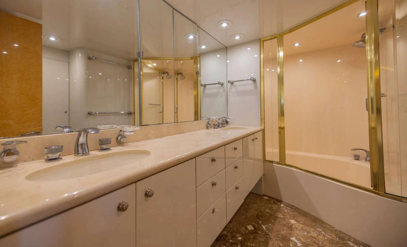 A sofa sits to the left. Extensive wardrobe space flanks both sides of the bed. The En-suite bathroom, situated aft, includes a sink, toilet, and shower. The VIP stateroom also offers a double bed with an adjacent widescreen TV.