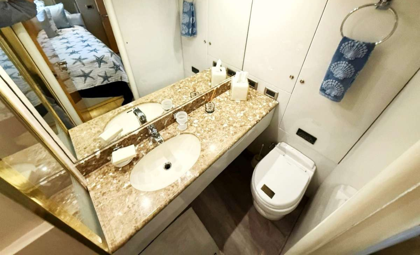 The VIP stateroom also offers a double bed with an adjacent widescreen TV. It provides ample closet space and a private bathroom equipped with a sink, toilet, and shower.
