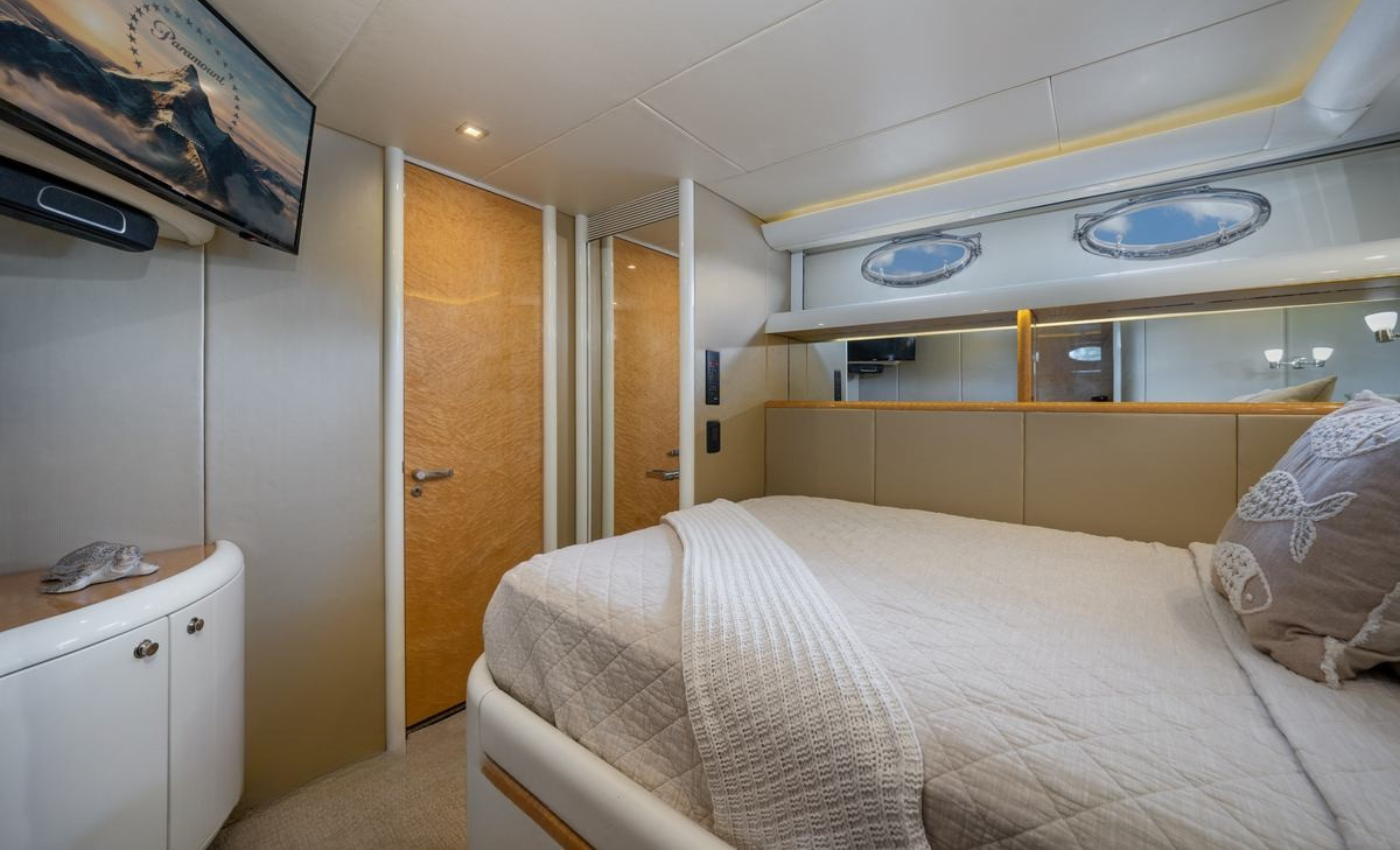 A sofa sits to the left. Extensive wardrobe space flanks both sides of the bed. The En-suite bathroom, situated aft, includes a sink, toilet, and shower. The VIP stateroom also offers a double bed with an adjacent widescreen TV.