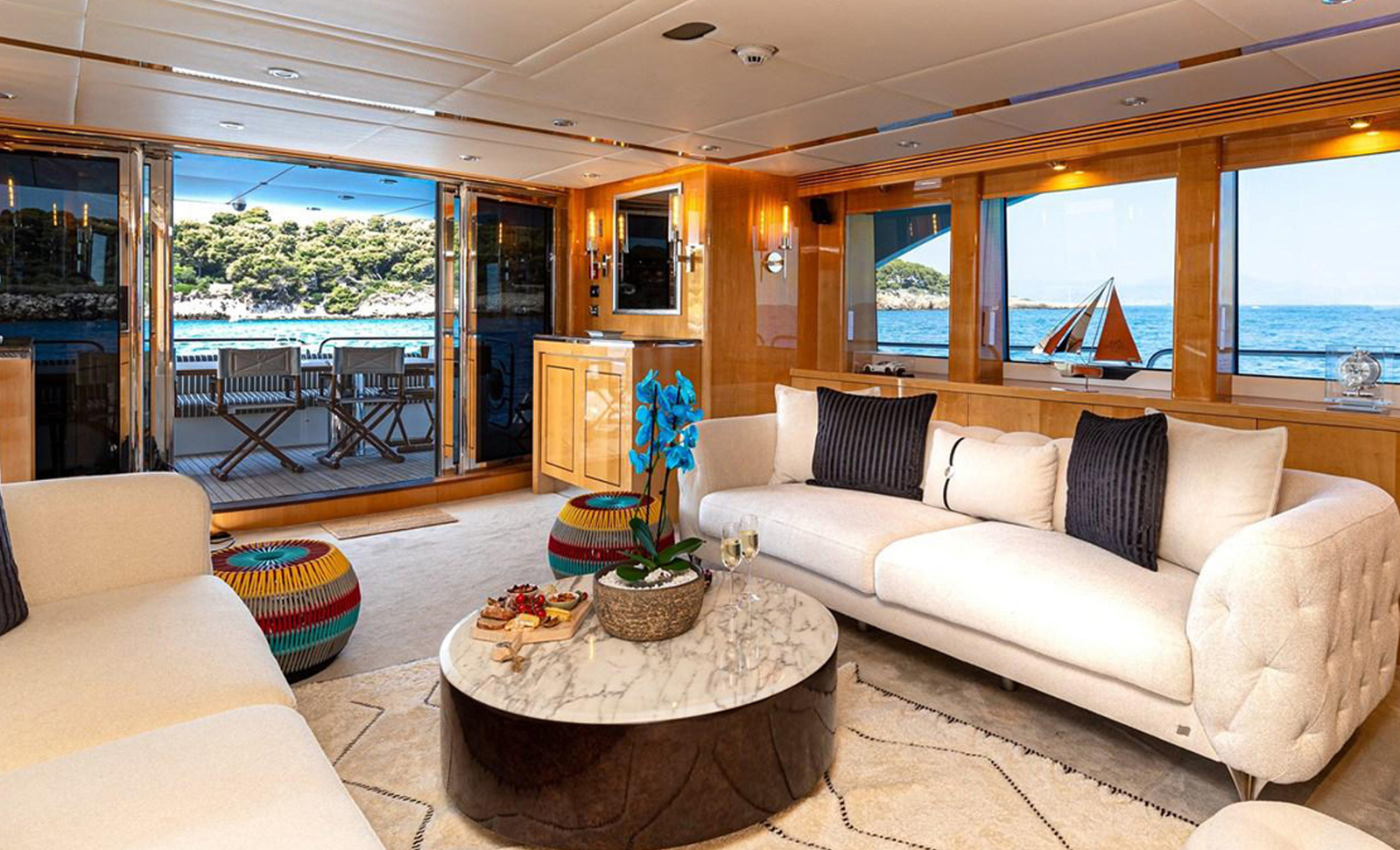 Inside, BLADE I reveals a warm and welcoming interior finished in high-gloss wood panelling, cream upholstery and refined detailing.
