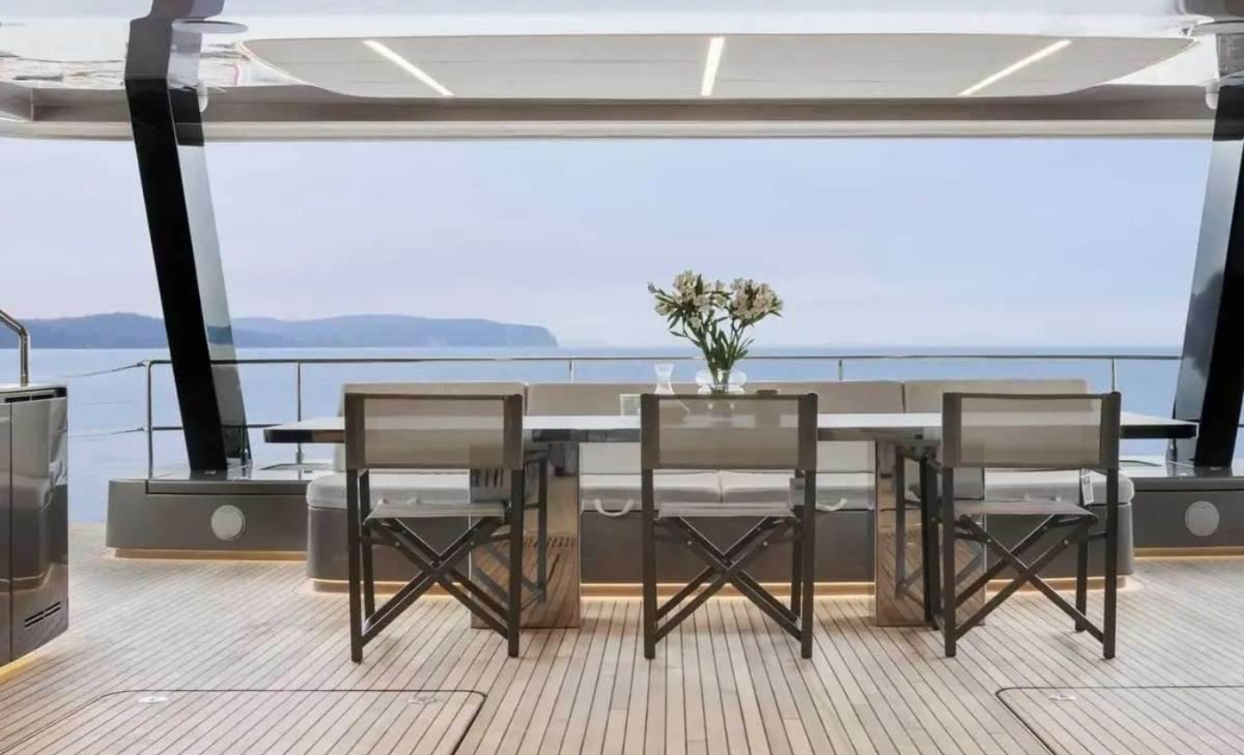 The aft cockpit is arranged for shaded dining, where a beautifully set table invites long, leisurely lunches cooled by passing trade winds. Steps descend to the hydraulic swim platform, forming a private sea terrace – ideal for ...