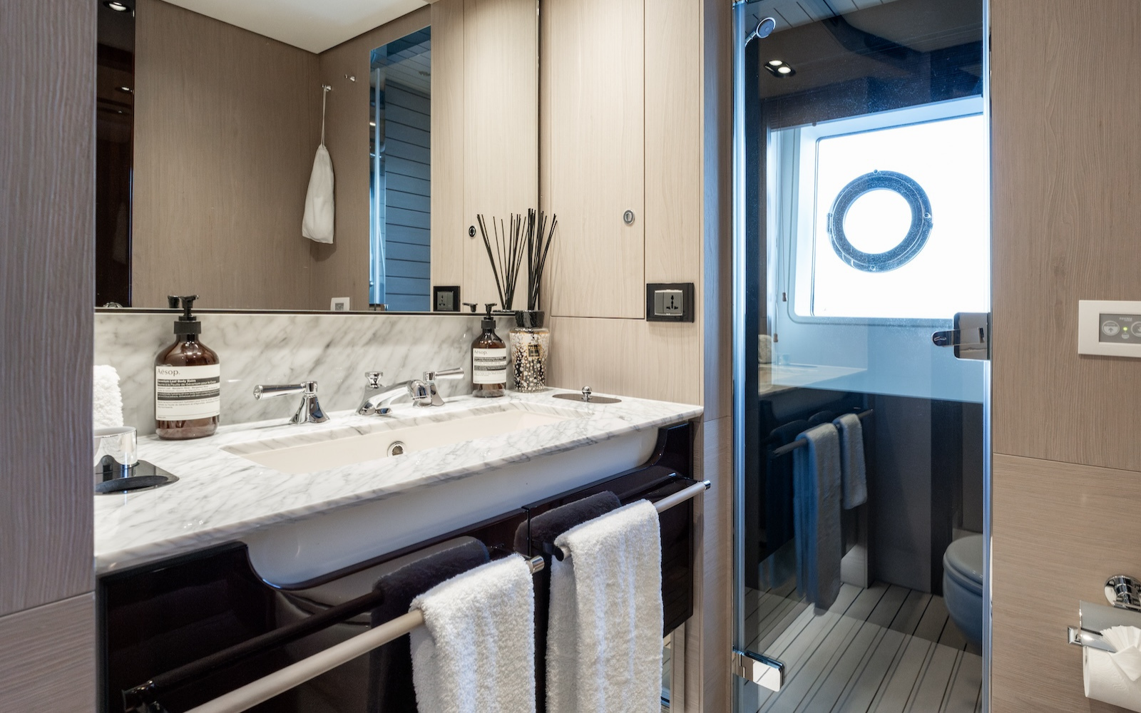 1 x guest cabin (starboard forward) has a double bed (150 x 200cm), large window and is en-suite with a shower.