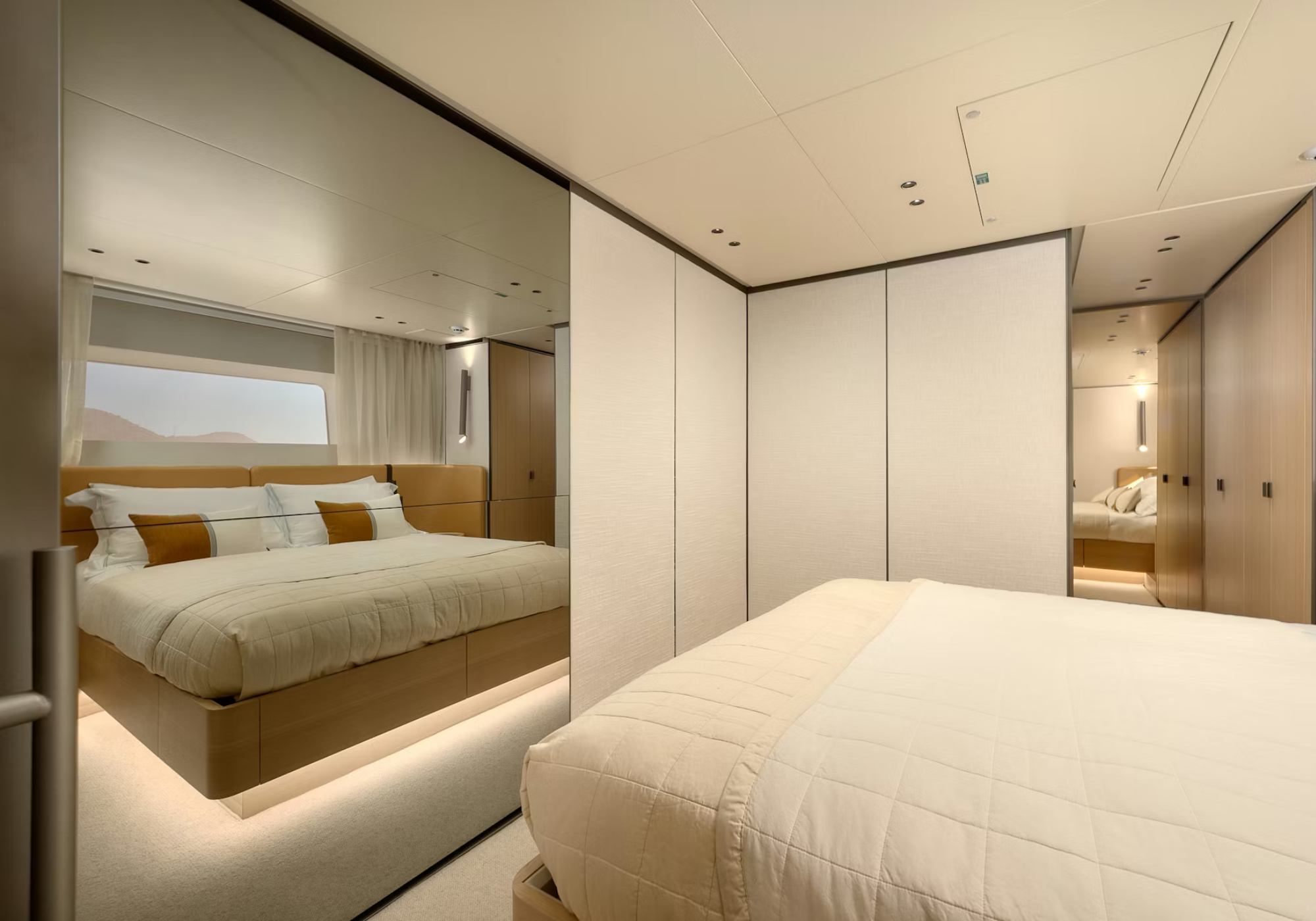 AFT | 2x mirrored Queen Staterooms featuring hidden TVs, nightstands. Ensuite with shower and single sink.
