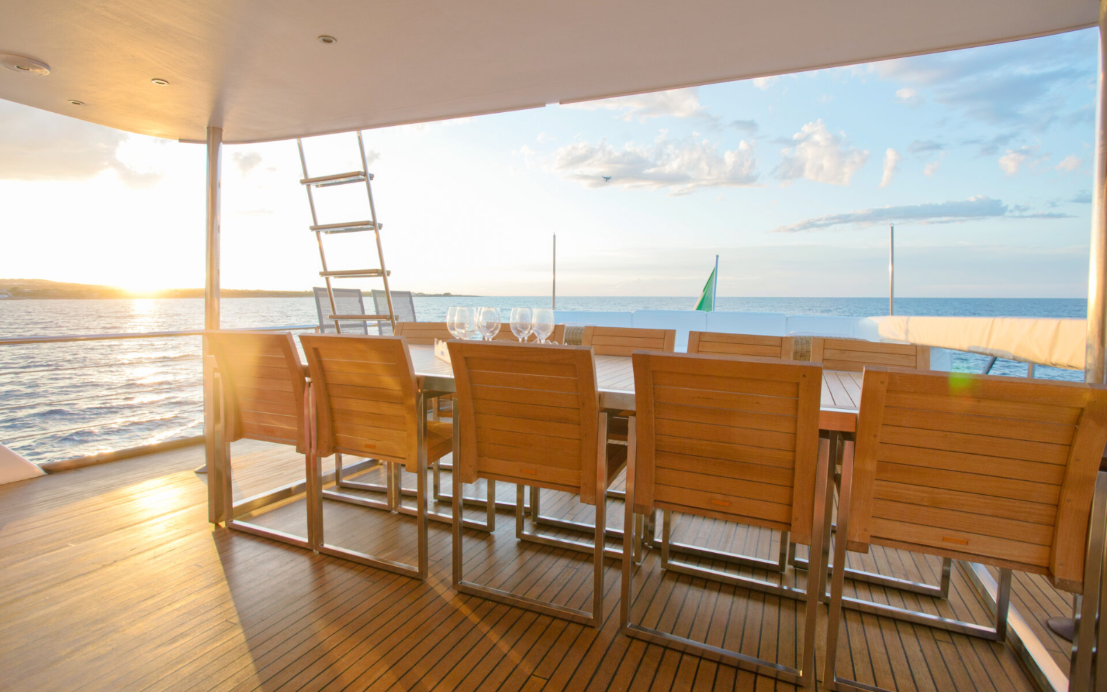The aft deck provides a generous setting for al fresco dining, with a large table perfectly positioned for long Mediterranean lunches. Above, the sundeck offers a relaxed lounge area complete with a minibar – an inviting space ...