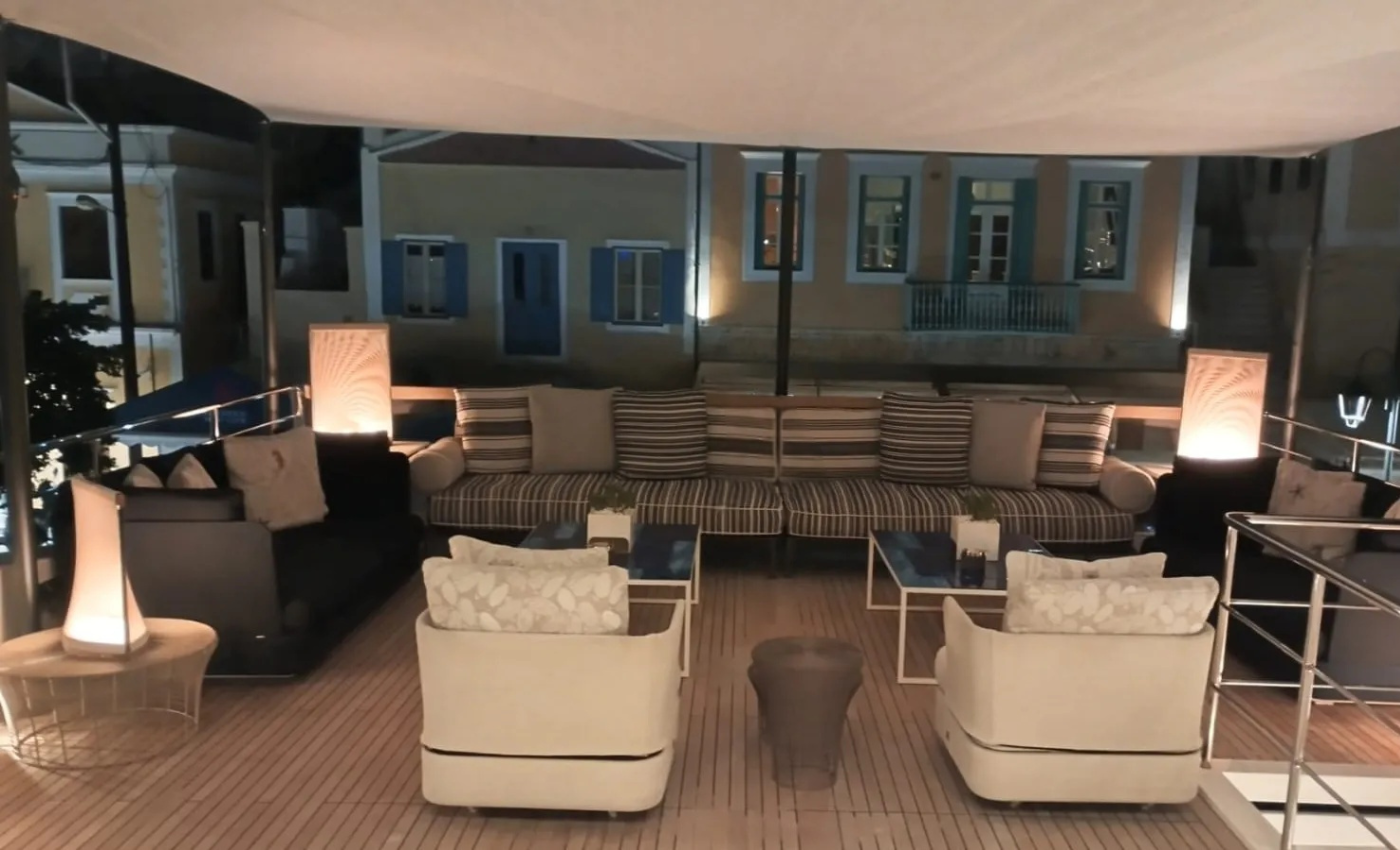 The main deck aft is arranged for relaxed outdoor dining, seamlessly connected to the interior salon through sliding doors and opening windows that blur the boundary between inside and out.