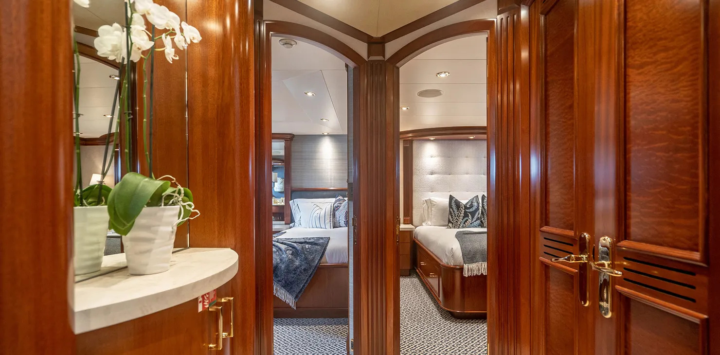 She was designed by naval architect Jack Sarin and decorated by interior designer Robin Rose. She offers a magnificent vacation experience for up to 9 guests who can be accommodated in four spacious cabins, all with ensuite bathrooms, safes and full entertainment facilities.