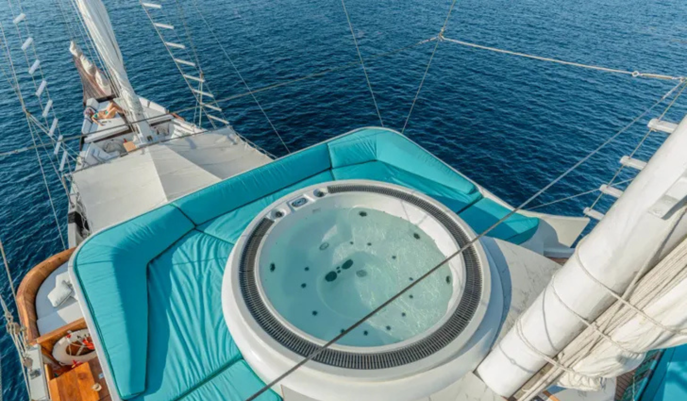 Welcoming up to eight guests in four serene cabins and attended by an exceptional crew of 10, KAYRA offers a rare blend of adventure, privacy and onboard wellness, complete with gym, sauna, spa room and a deck jacuzzi.