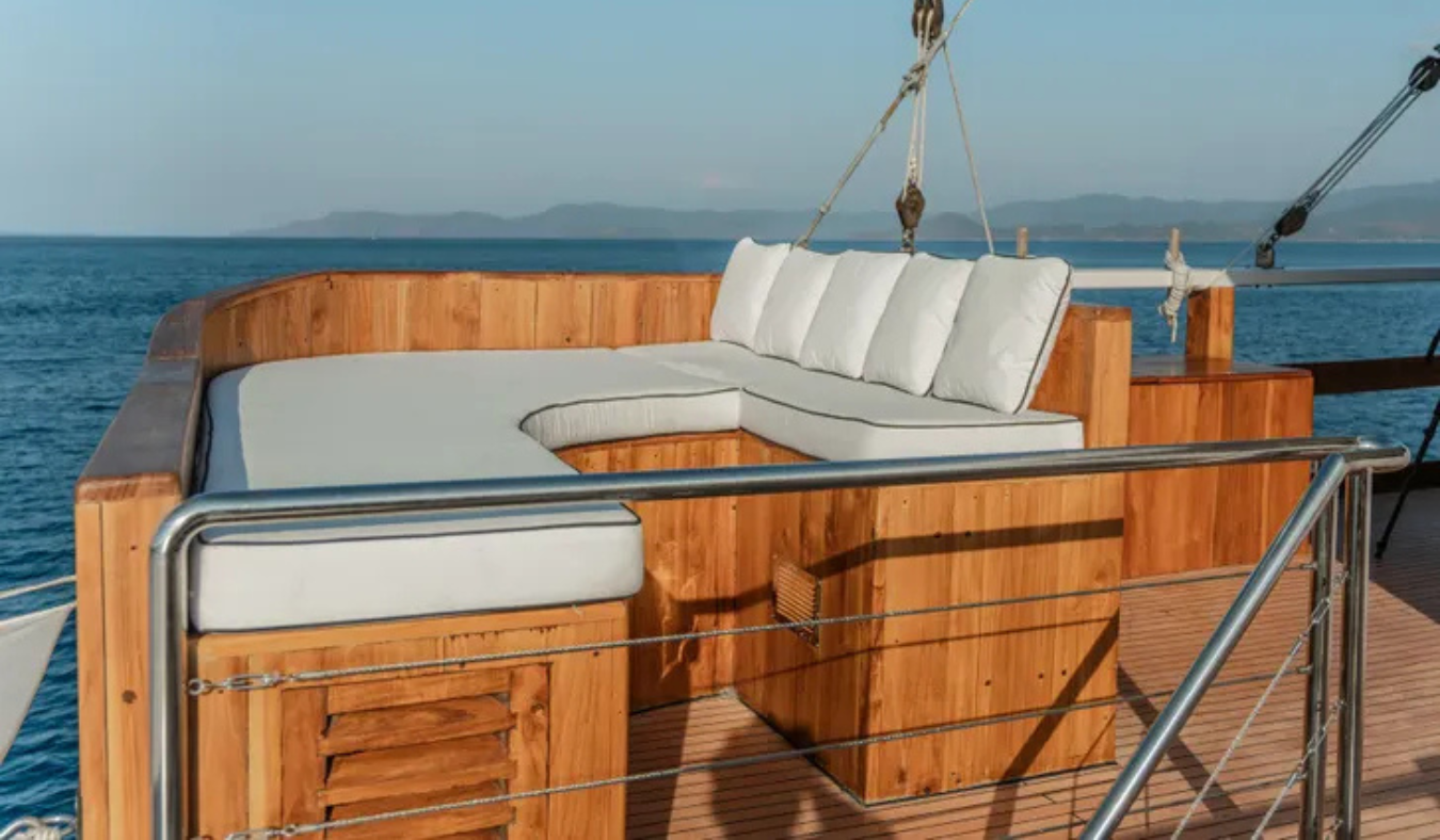 The foredeck is arranged for elegant al fresco dining beneath shade canopies – equally suited to breezy lunches or candlelit dinners under the stars.