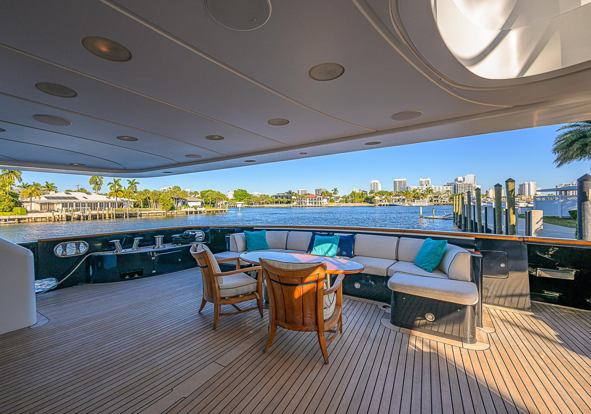 There's also a bar on this deck with a fridge. The central zone is entirely occupied by the open air dining area and is protected from sun and rain by a custom canopy. Forward are two mirrored sofa areas facing the bow, with ...