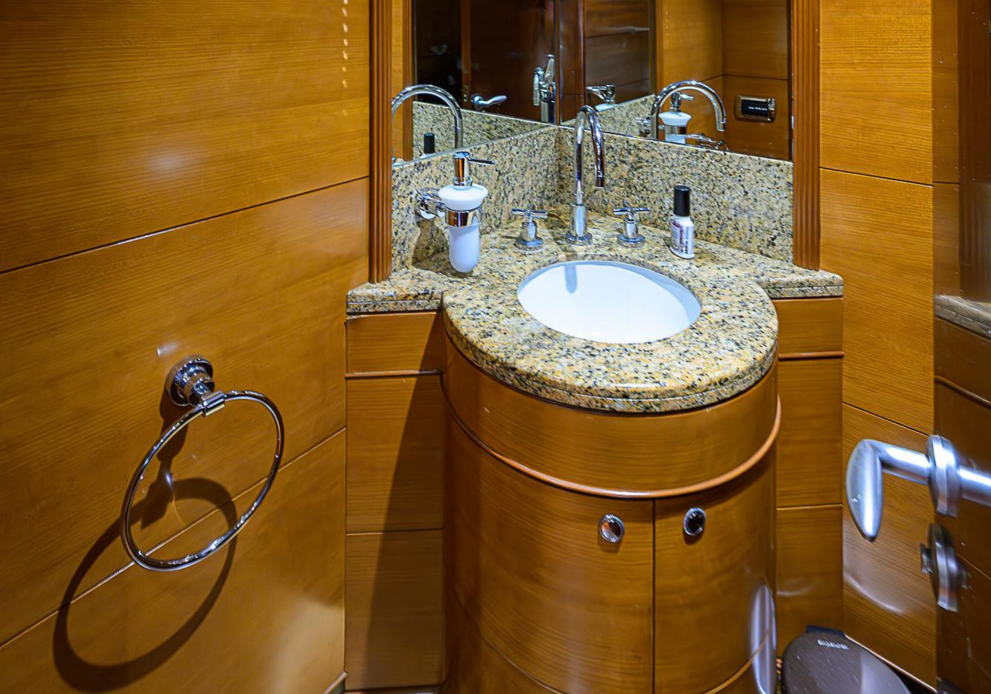 The exceptionally large sundeck has plenty of sunbathing cushions aft, linked to two C- shaped elements forward that surround a Jacuzzi pool. There's also a bar on this deck with a fridge.