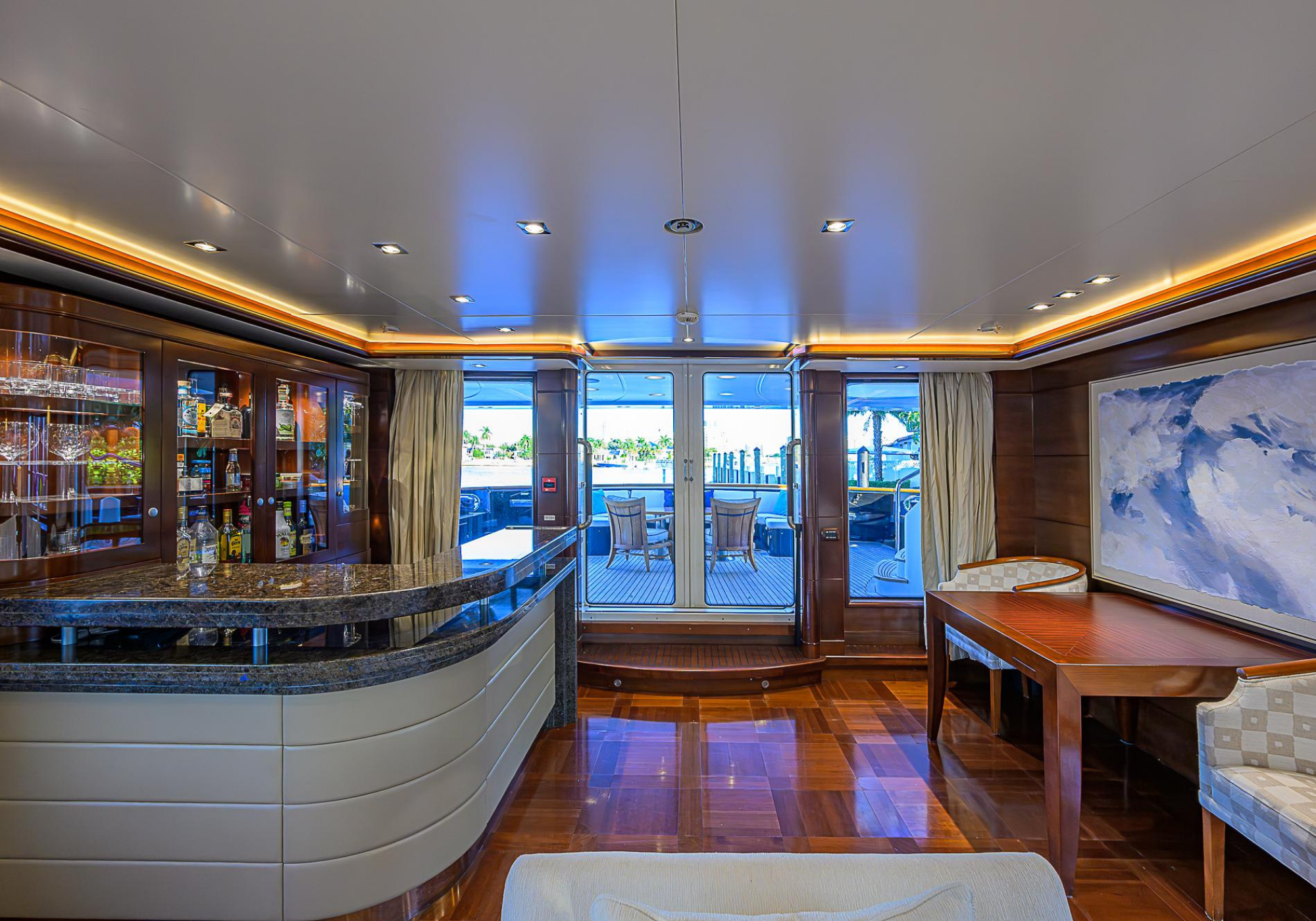 Forward of the dining room, is a second saloon with two L-shaped sofas, coffee tables and a small bar. The forward section of the upper deck is devoted to navigation with a very well designed bridge that offers excellent all ...