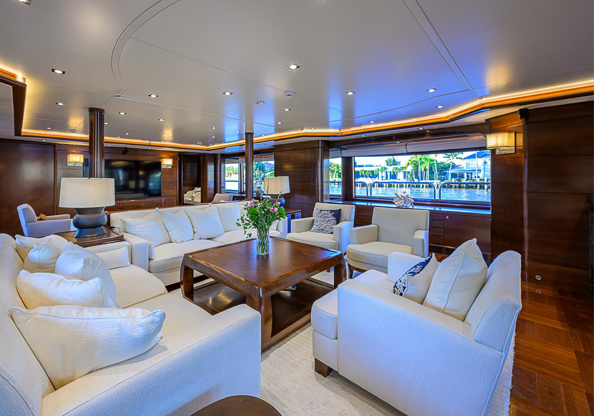 There's also a bar on this deck with a fridge. The central zone is entirely occupied by the open air dining area and is protected from sun and rain by a custom canopy. Forward are two mirrored sofa areas facing the bow, with ...