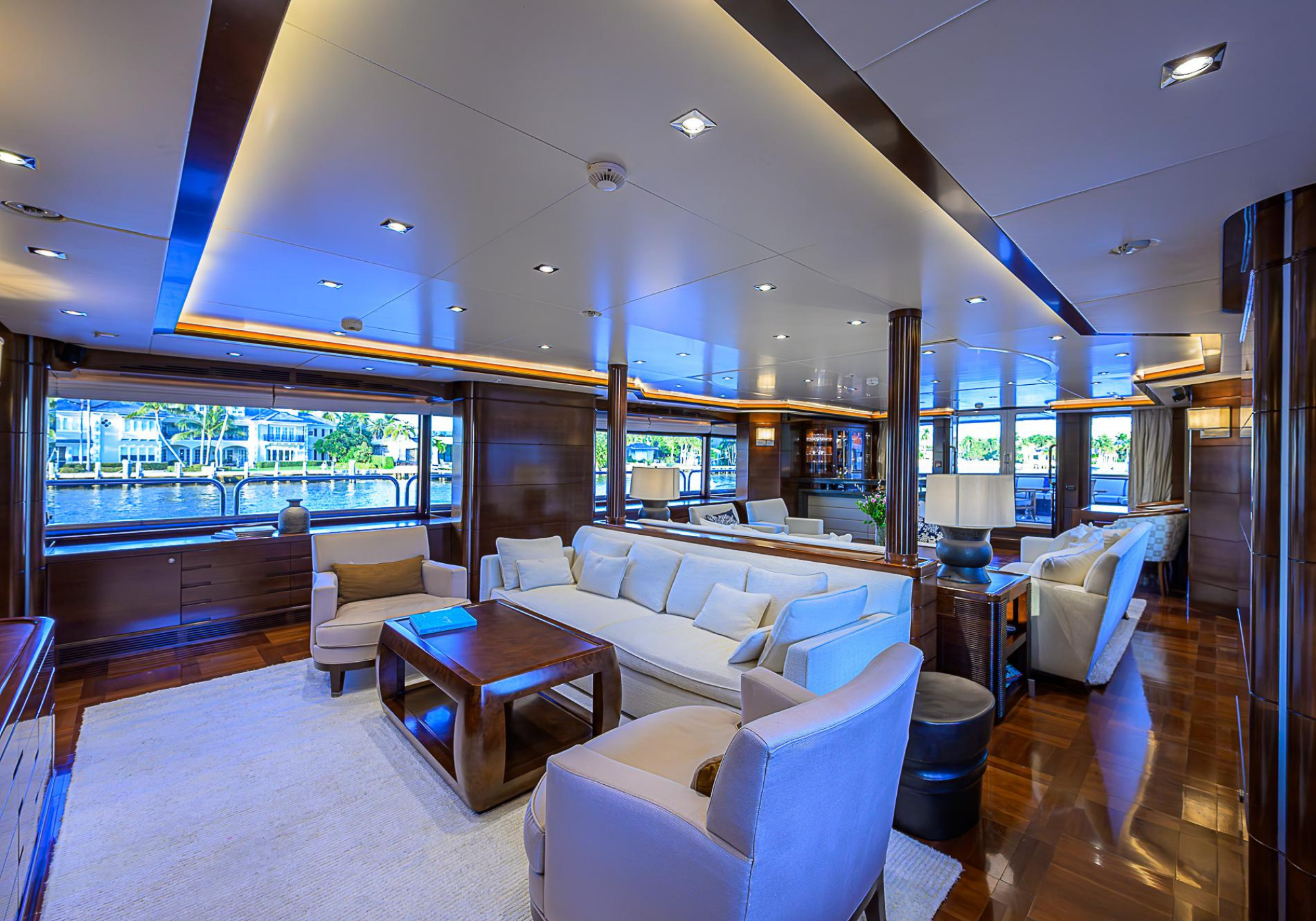 A separate dressing room is located off to port, adjacent 'her' bathroom. A circular staircase is placed amidships adjacent to the galley and disserves the guest quarters. The main saloon is located in the aft portion of the main deck. It is particularly large as the owner requested that the dinning saloon be re-located to the upper deck.