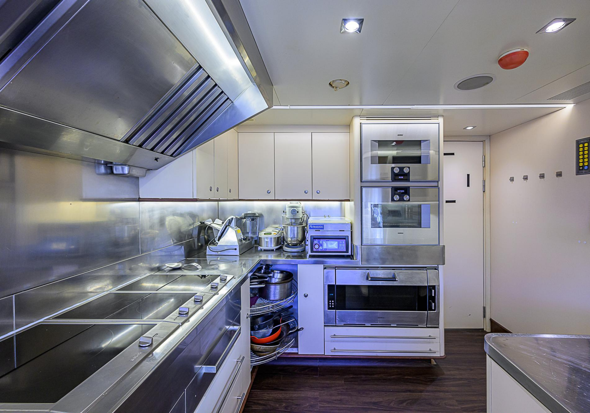 The cabin has panoramic windows and a central bed that allows for 180° views. The suite is accessed by way of an adjacent office and there are two bathrooms: 'his' with a shower, and 'hers' with a Jacuzzi that looks onto one of the large perimeter windows. A separate dressing room is located off to port, adjacent 'her' bathroom.