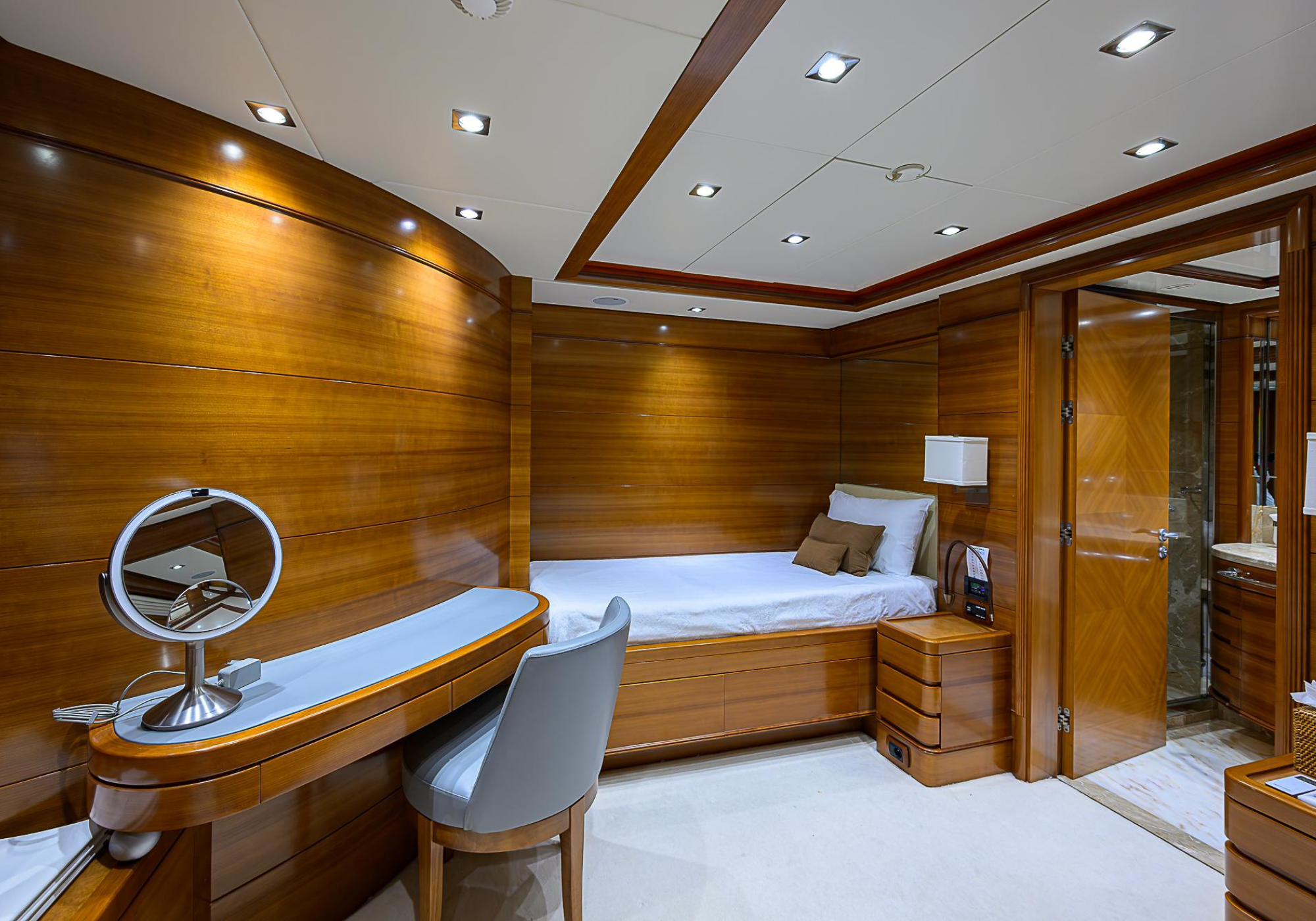 The lower deck has four guest cabins accessible by the central staircase. The cabins are spacious and bright thanks to the use of light colored cherry and large port holes. The two doubles are located aft and have private bathrooms, dressing tables and wardrobes.
