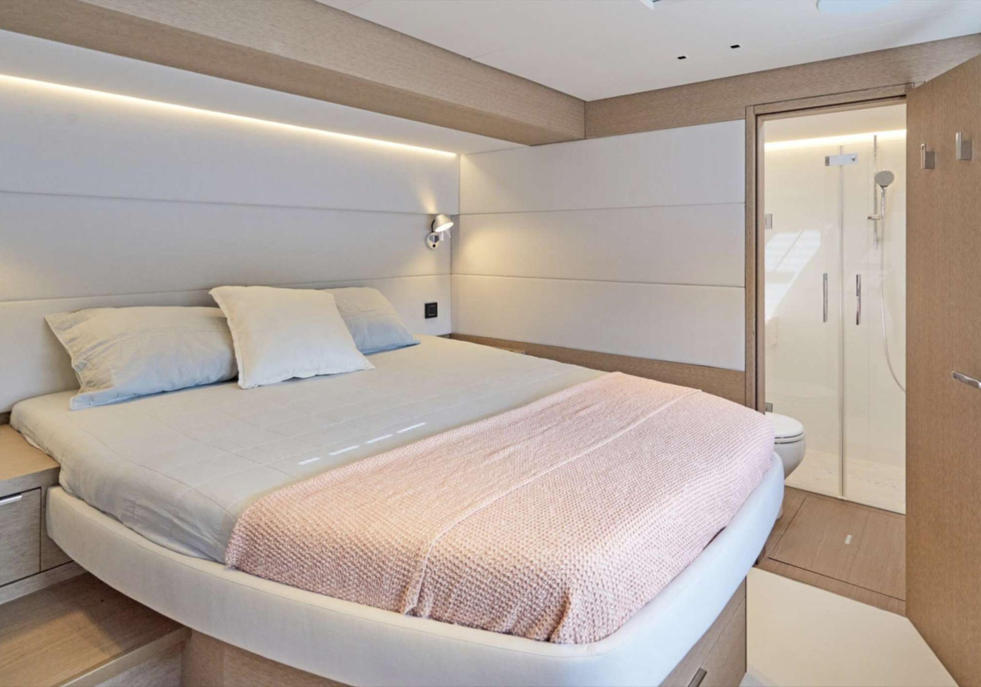 ~One owner's suite with desk area and large bathroom and separate toilet with direct access to deck. Three guest cabins withe queen size bed and separate bathrooms.