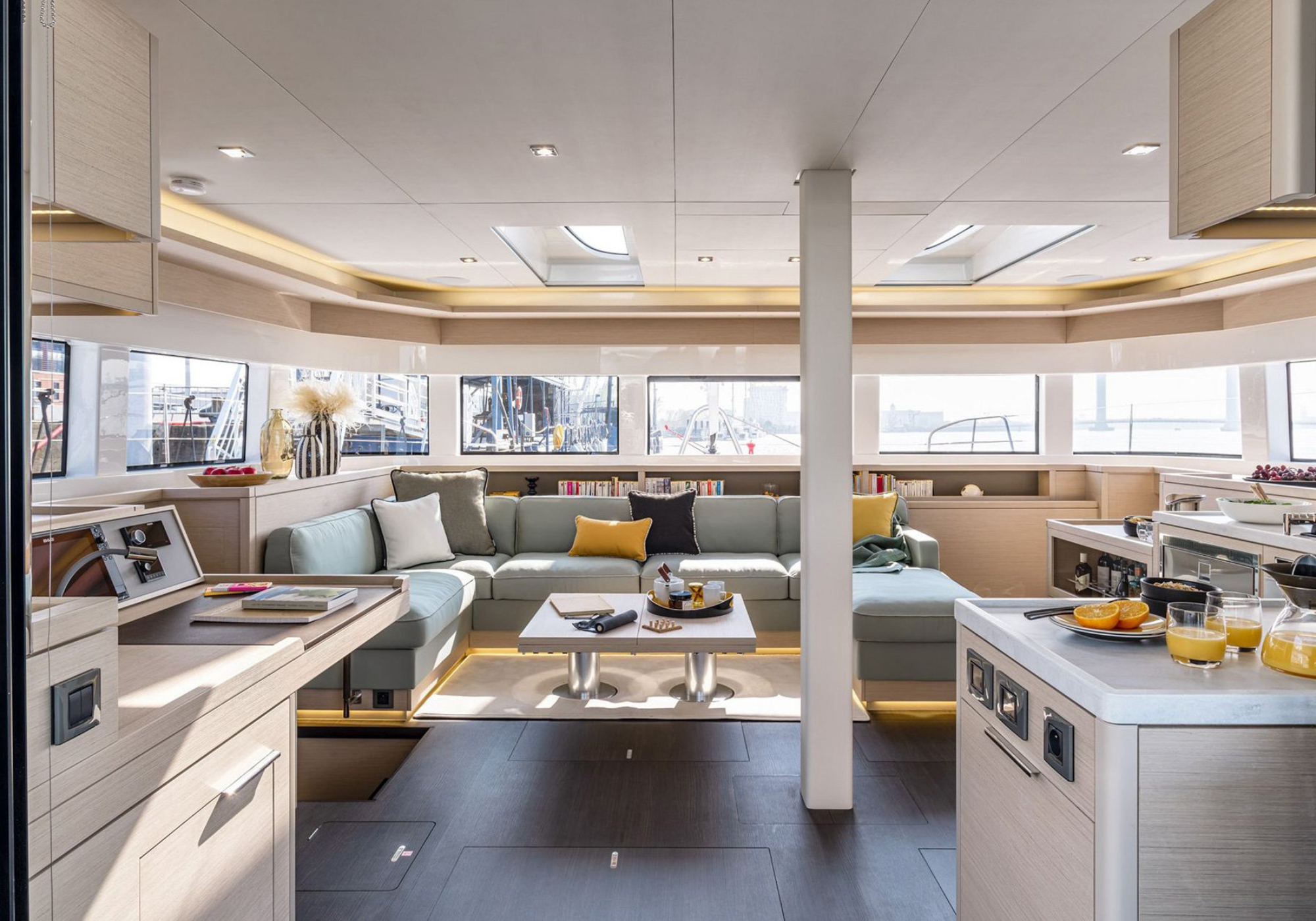 The aft cockpit is arranged for sociable dining and lounging, seamlessly connected to the saloon through wide sliding doors, allowing guests to move effortlessly between interior and exterior spaces.