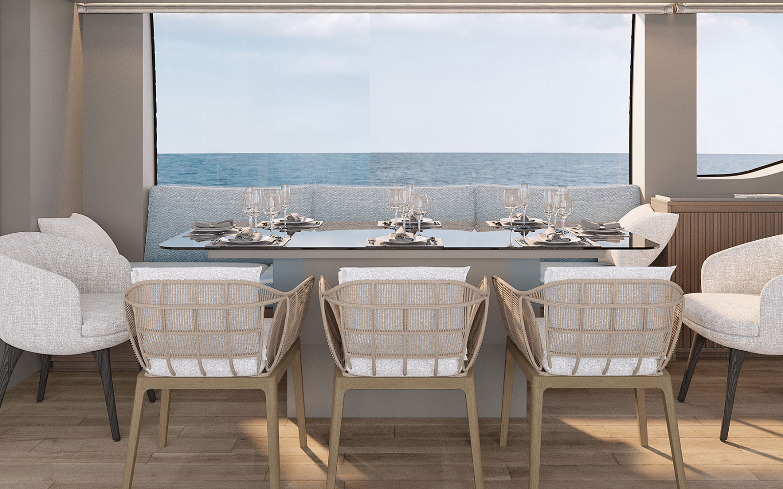 On the main deck aft, a shaded dining area provides an inviting setting for al fresco meals overlooking the water.
