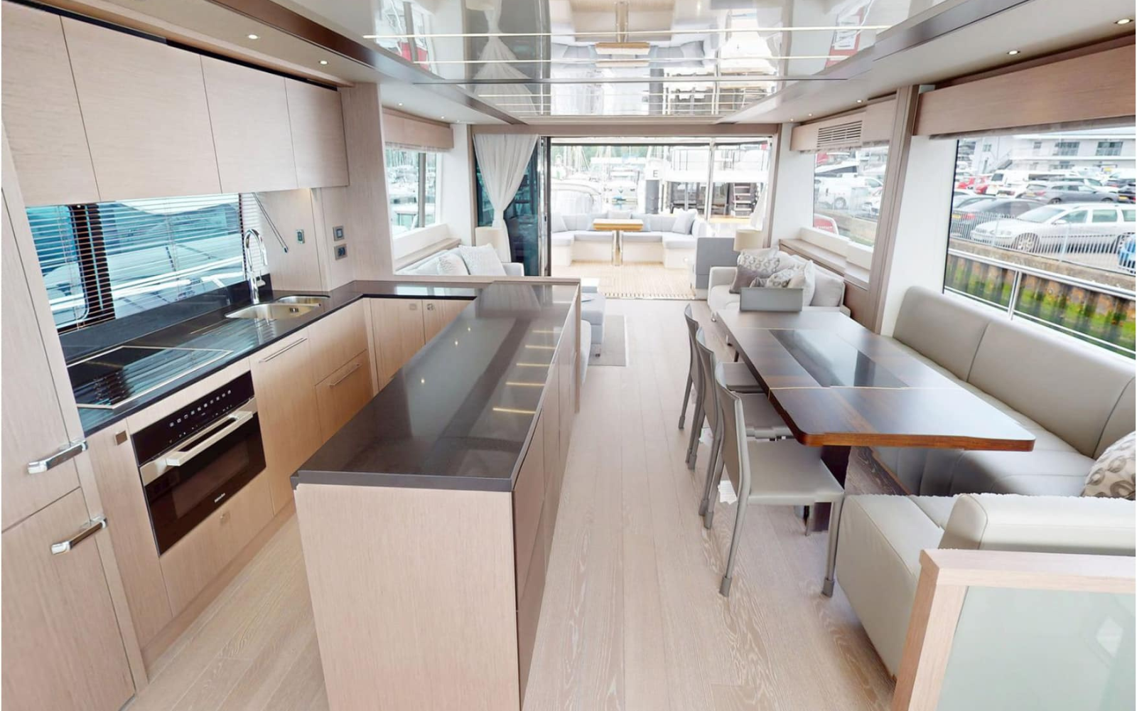 Once on board, the main deck opens into a beautifully designed open-plan living area, offering an almost 360-degree view and an inviting sense of space—perfect for socialising, relaxing, and entertaining.