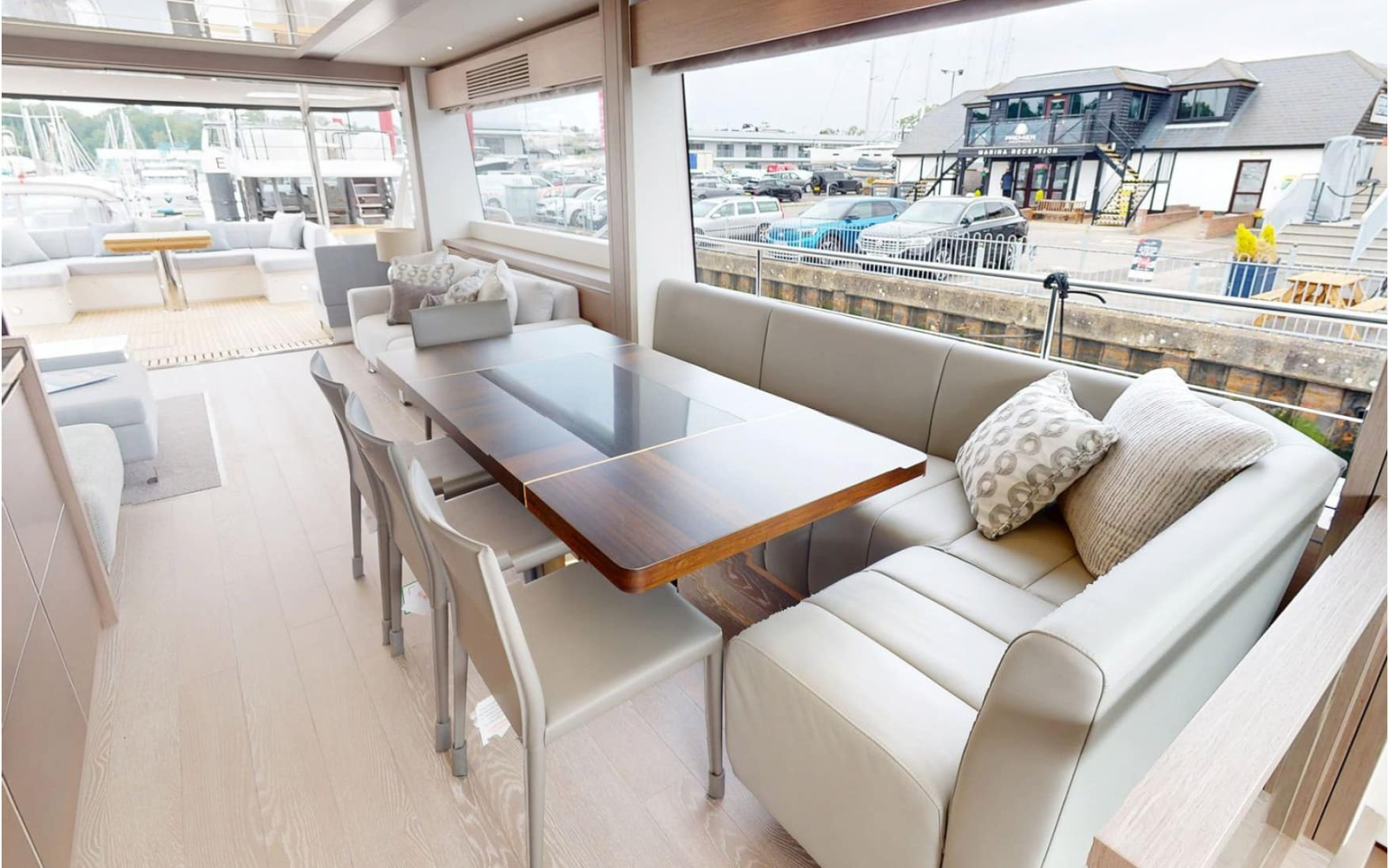 Once on board, the main deck opens into a beautifully designed open-plan living area, offering an almost 360-degree view and an inviting sense of space—perfect for socialising, relaxing, and entertaining.