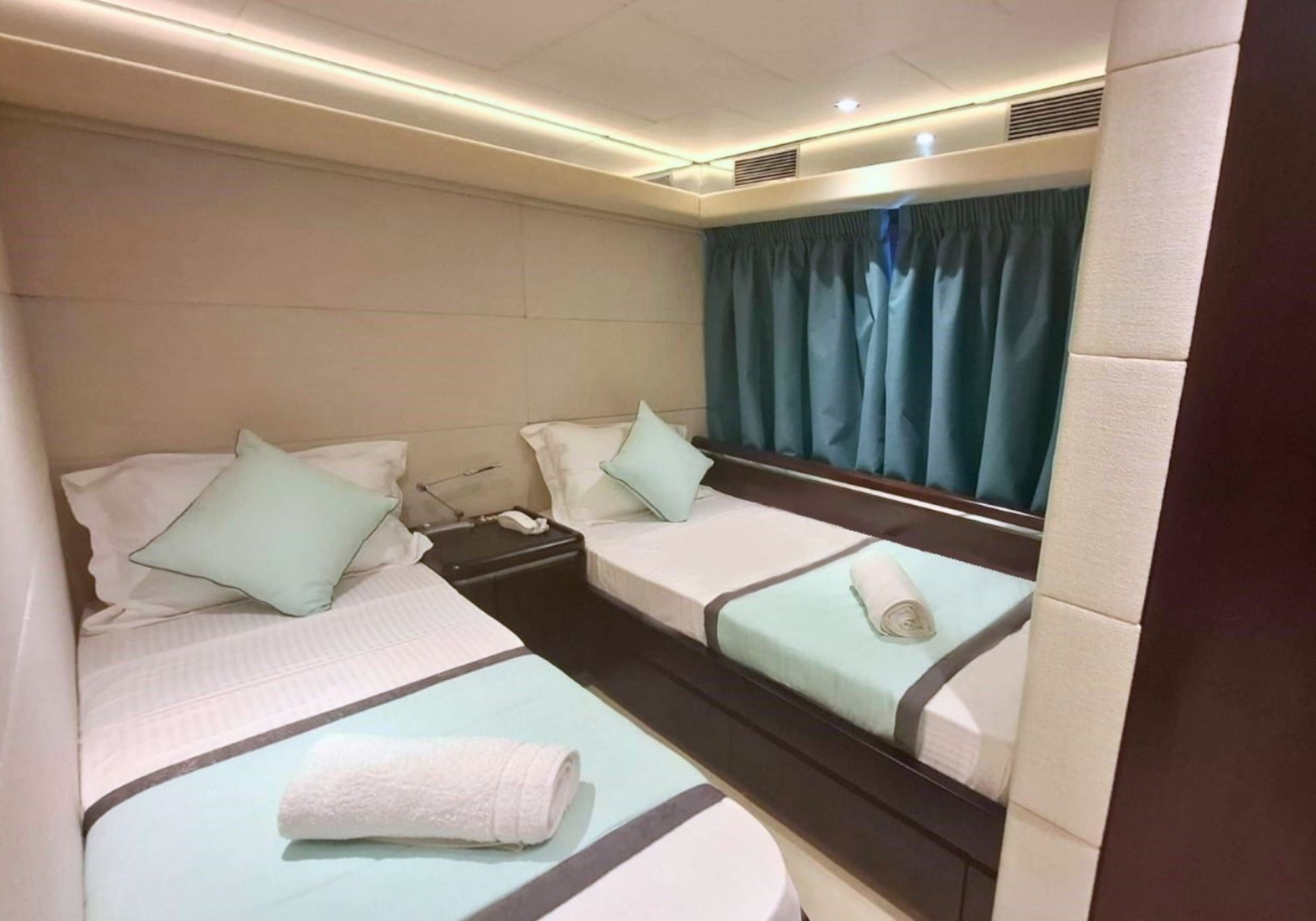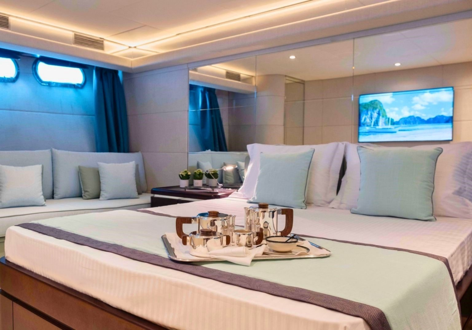 On the main deck, there is a multifunctional lounge/playroom that can be converted into a double cabin, with the sofa transforming into a double bed.
