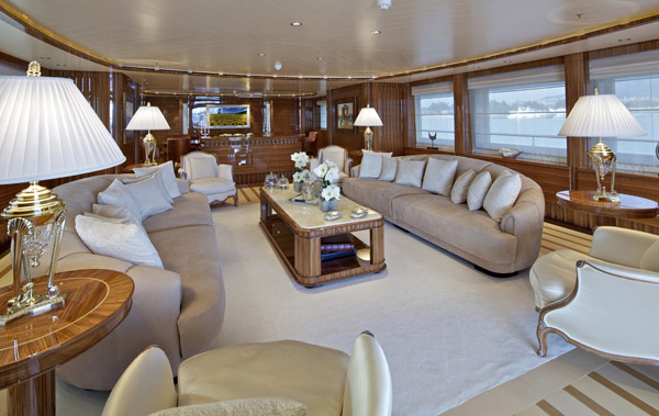 On the main deck, the salon is generous, boasting a large seating area, coffee table, panoramic windows and pop up entertainment center. Forward of the entertainment center is a full beam formal dining area, seating up to 12 guests in sumptuous style.